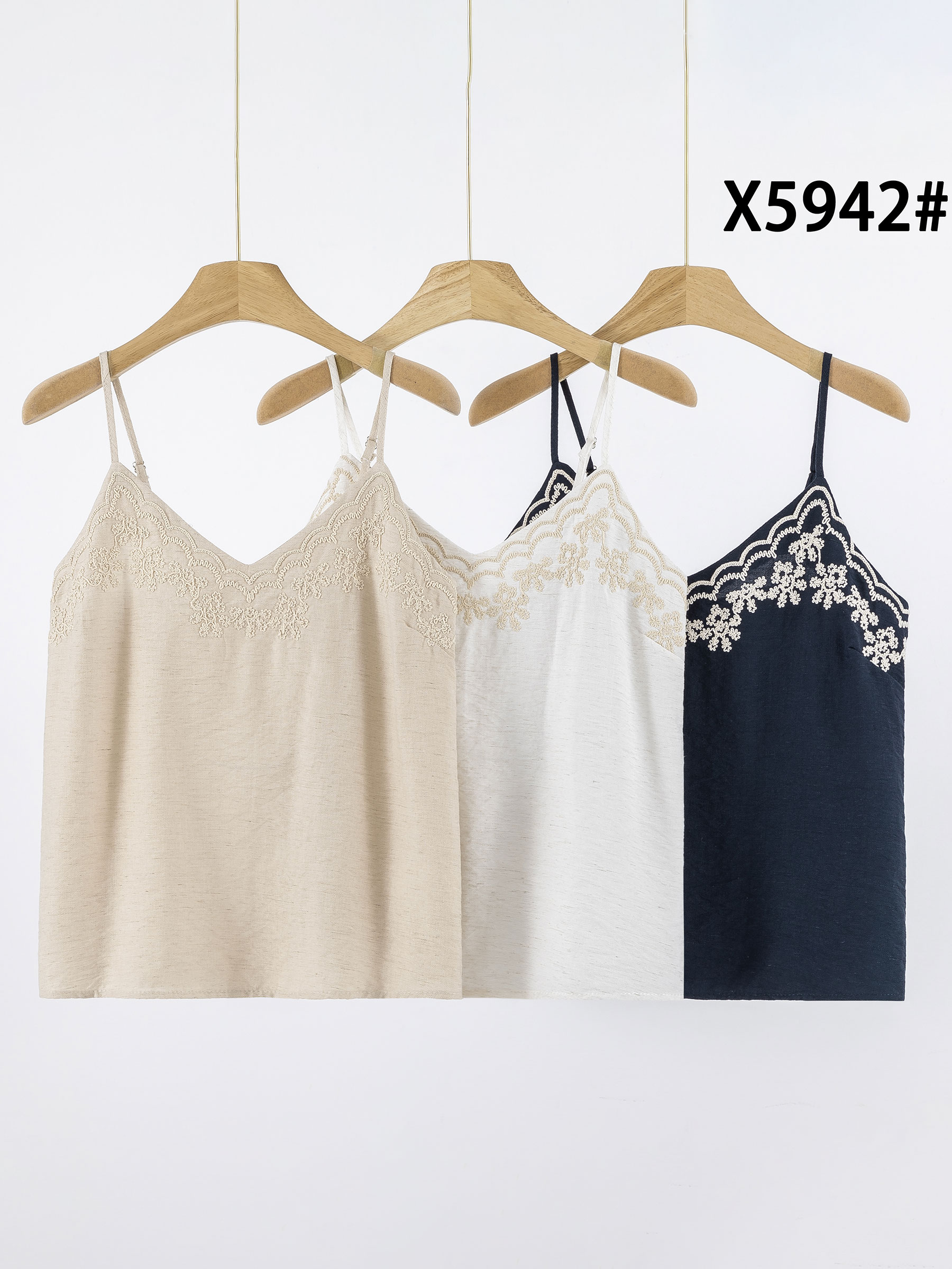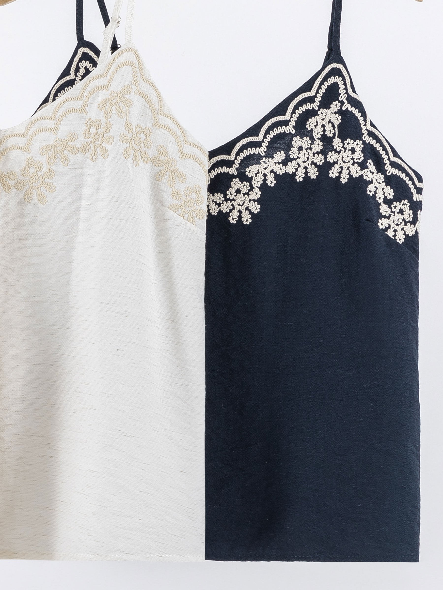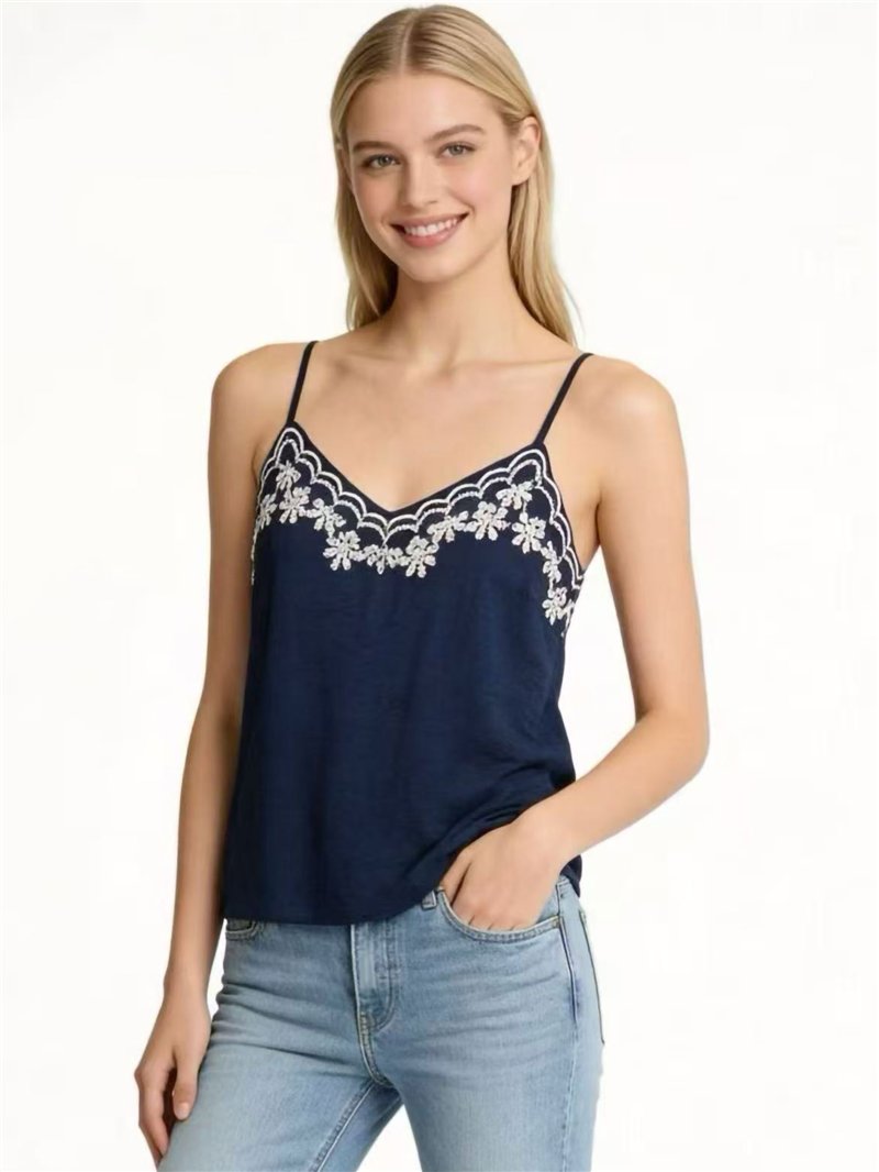 Top lencero. Bordado floral en contraste. Escote pico. Tirante fino.