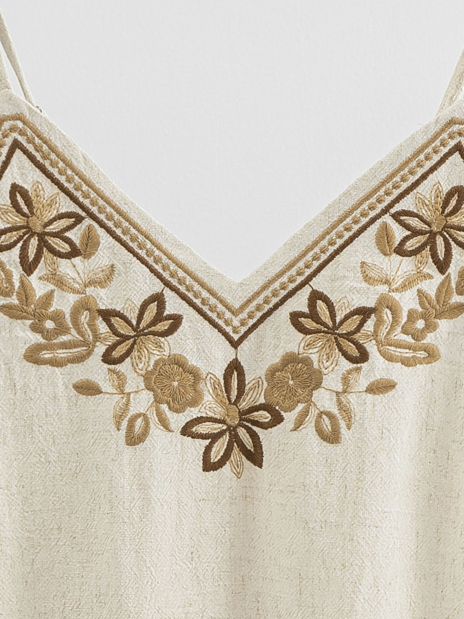 Top de lino. Bordado floral en contraste. Escote pico. Tirante fino.