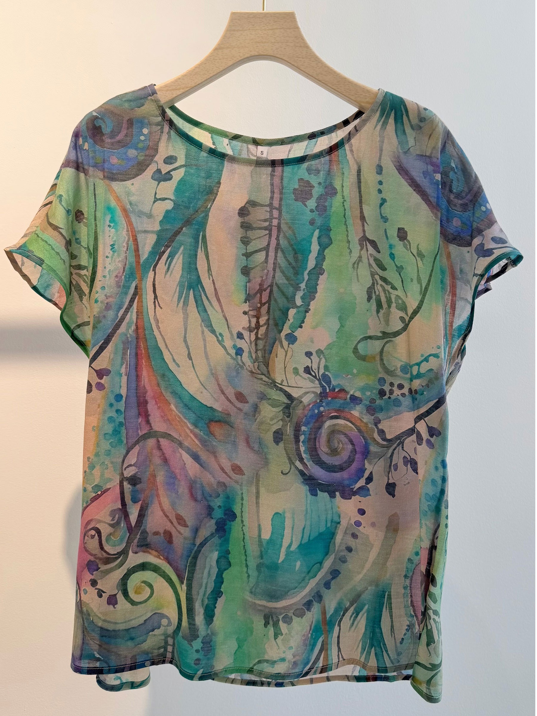 Blusa estampada. Estampado abstracto multicolor. Cuello redondo. Manga corta.