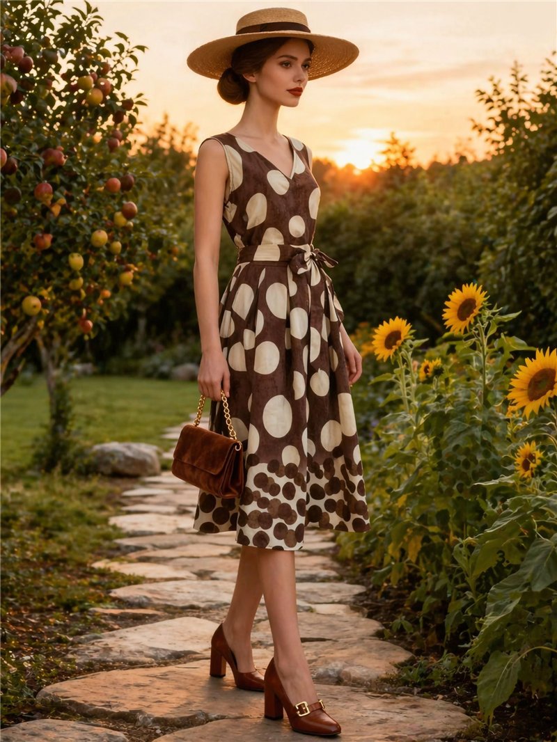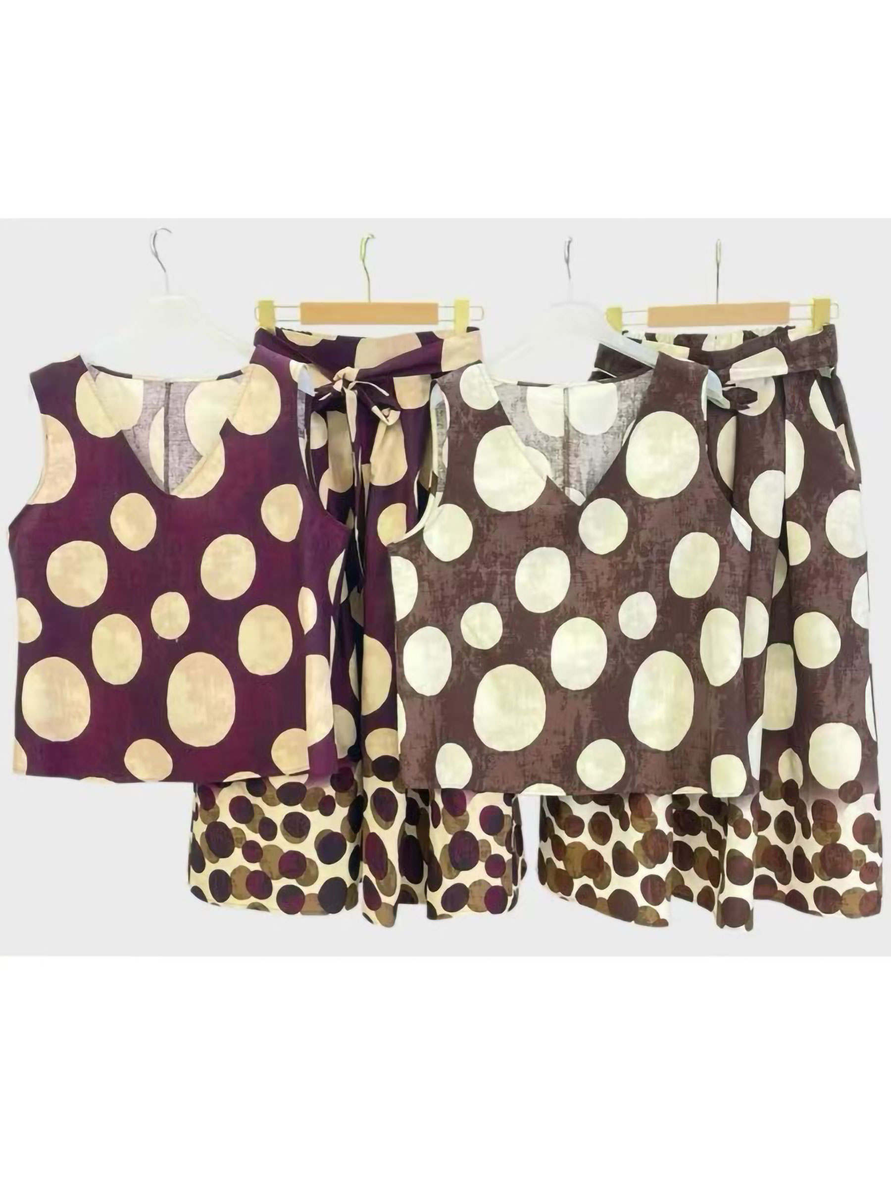 Conjunto de dos piezas. Top sin mangas. Falda midi. Estampado lunares. Cintura con lazada.