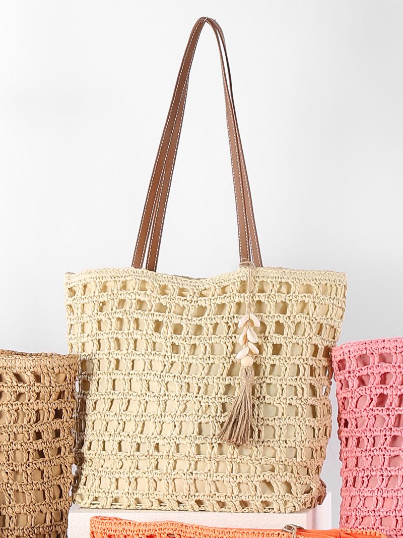 Bolso tote de rafia calada con borla y conchas