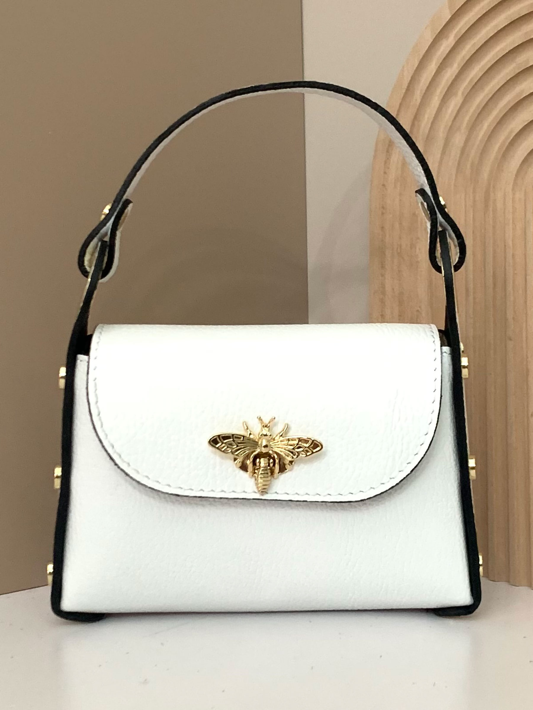 Mini bolso de mano de piel. Detalle tachas. Asa de mano. Asa de hombro de cadena. Cierre metálico en la solapa. Fabricado en Italia.