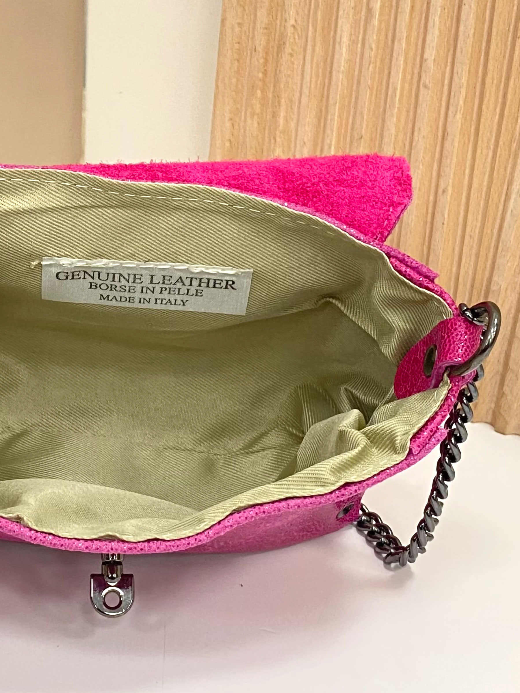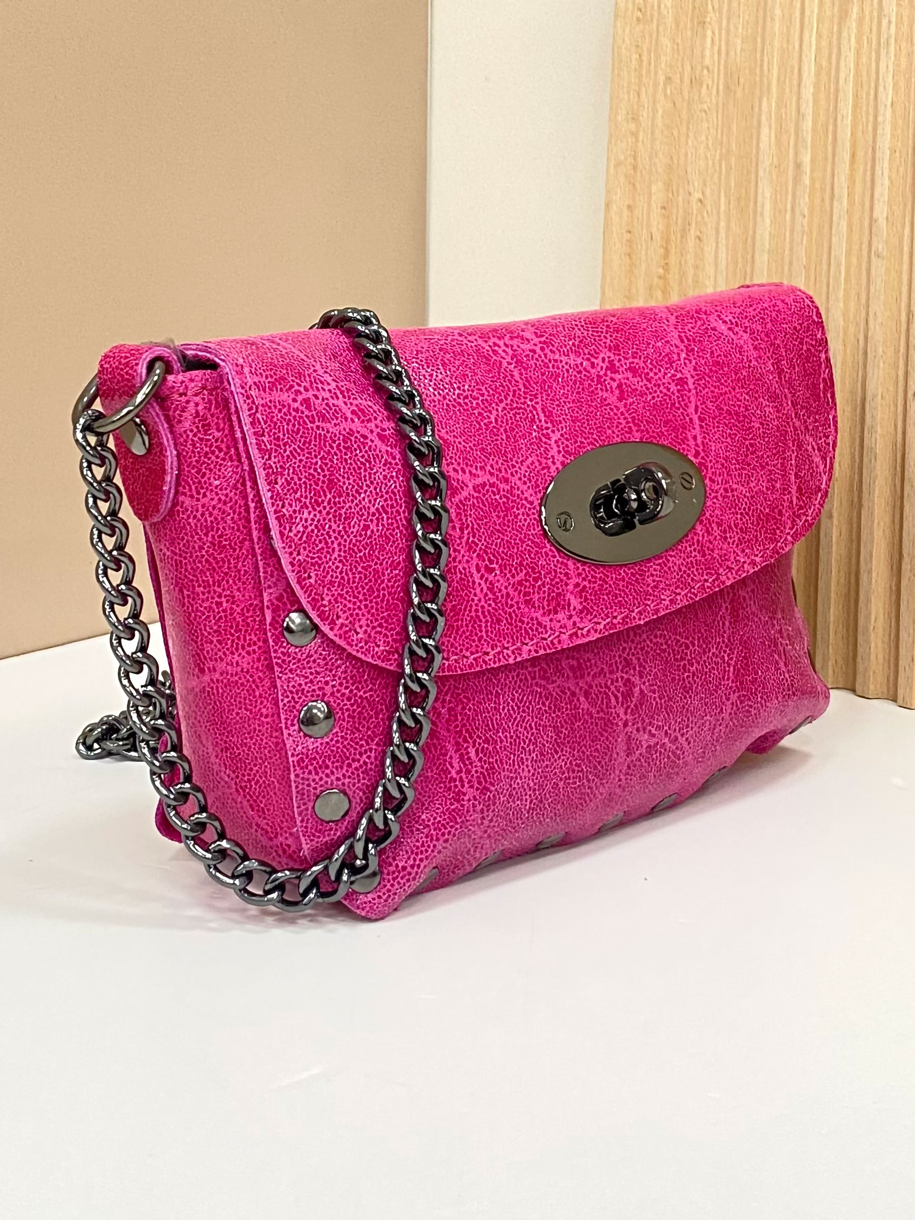Mini bolso de mano de piel. Asa de mano con cadena. Cierre metálico en la solapa. Fabricado en Italia.