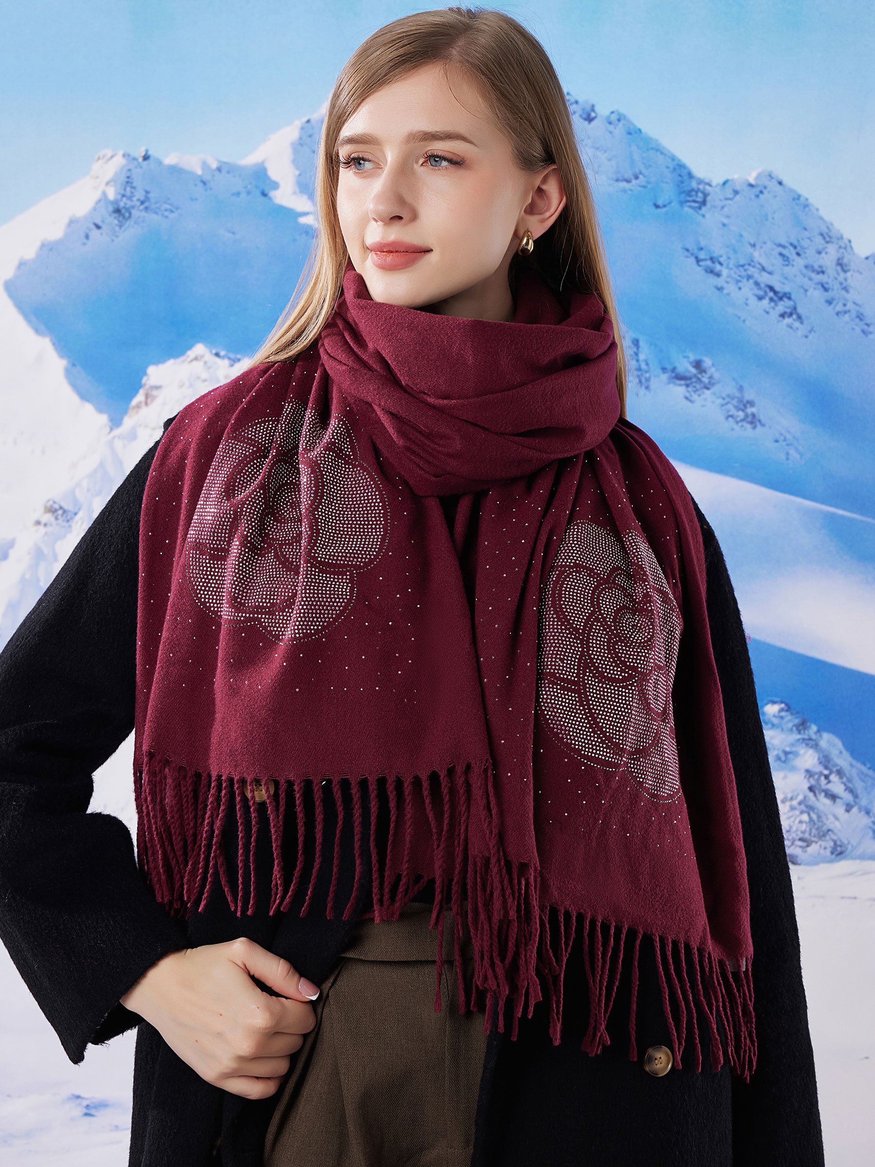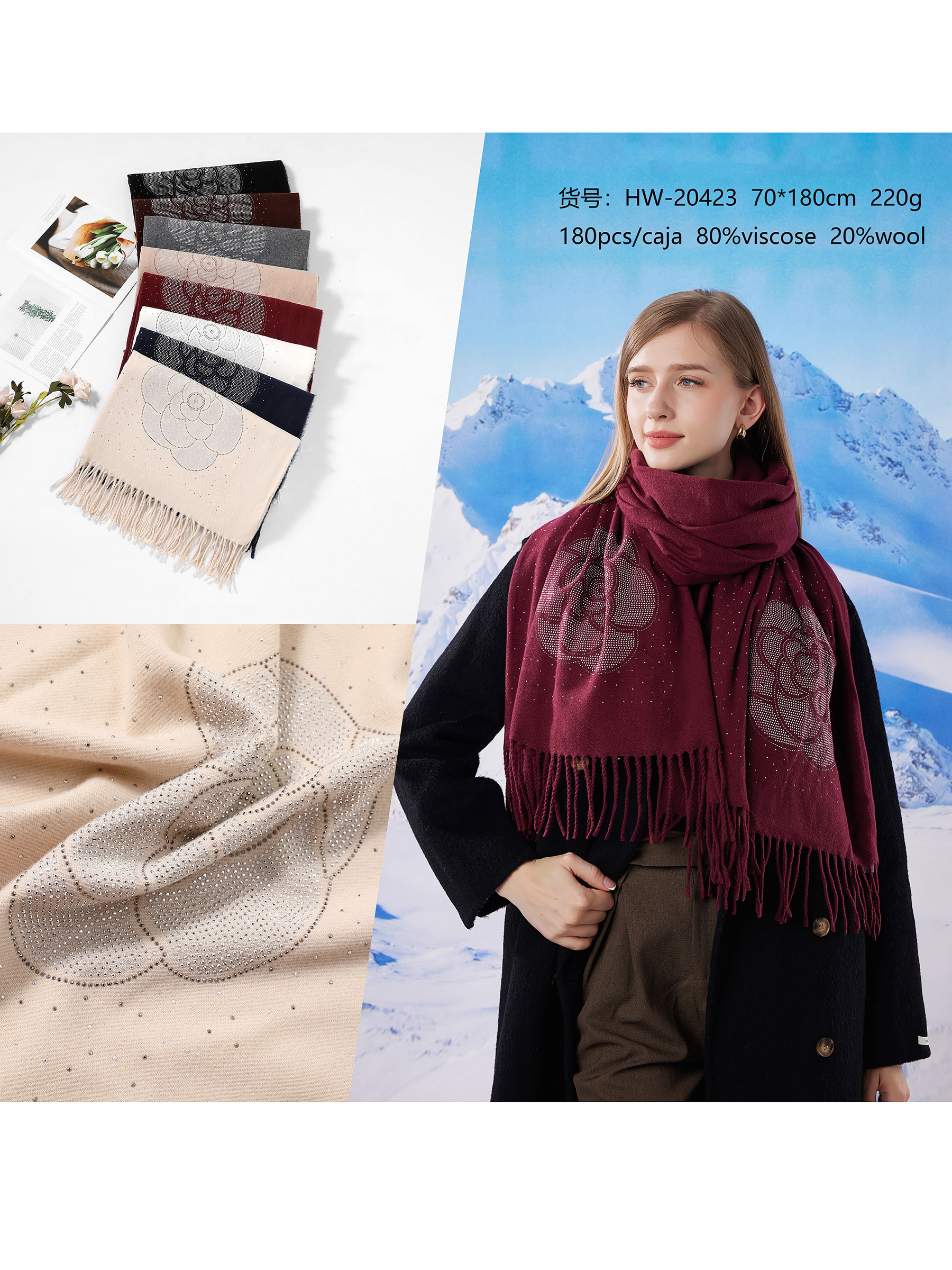 Detalles de bufanda flor strass flecos HY-HW-20423
