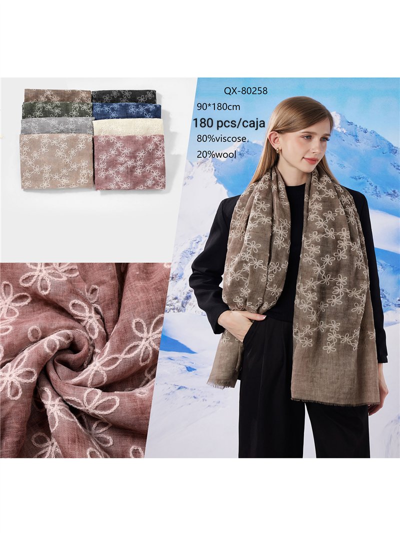 Bufanda bordada. Acabados desflecados. Tacto suave.