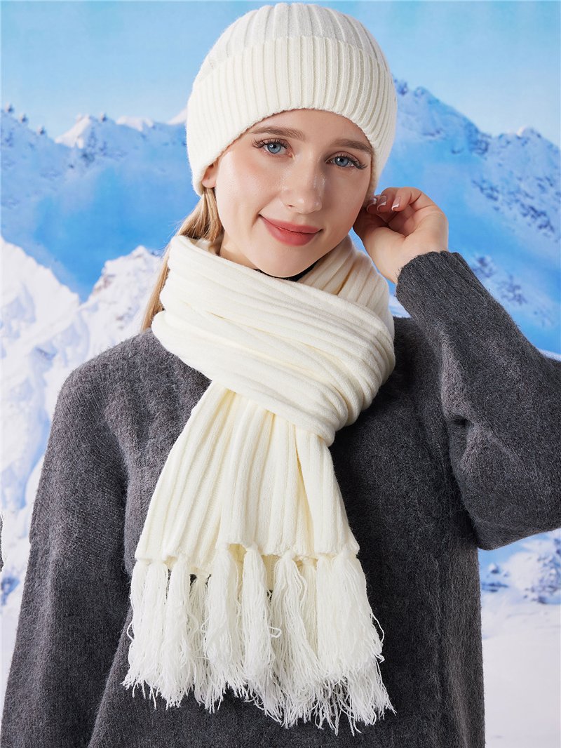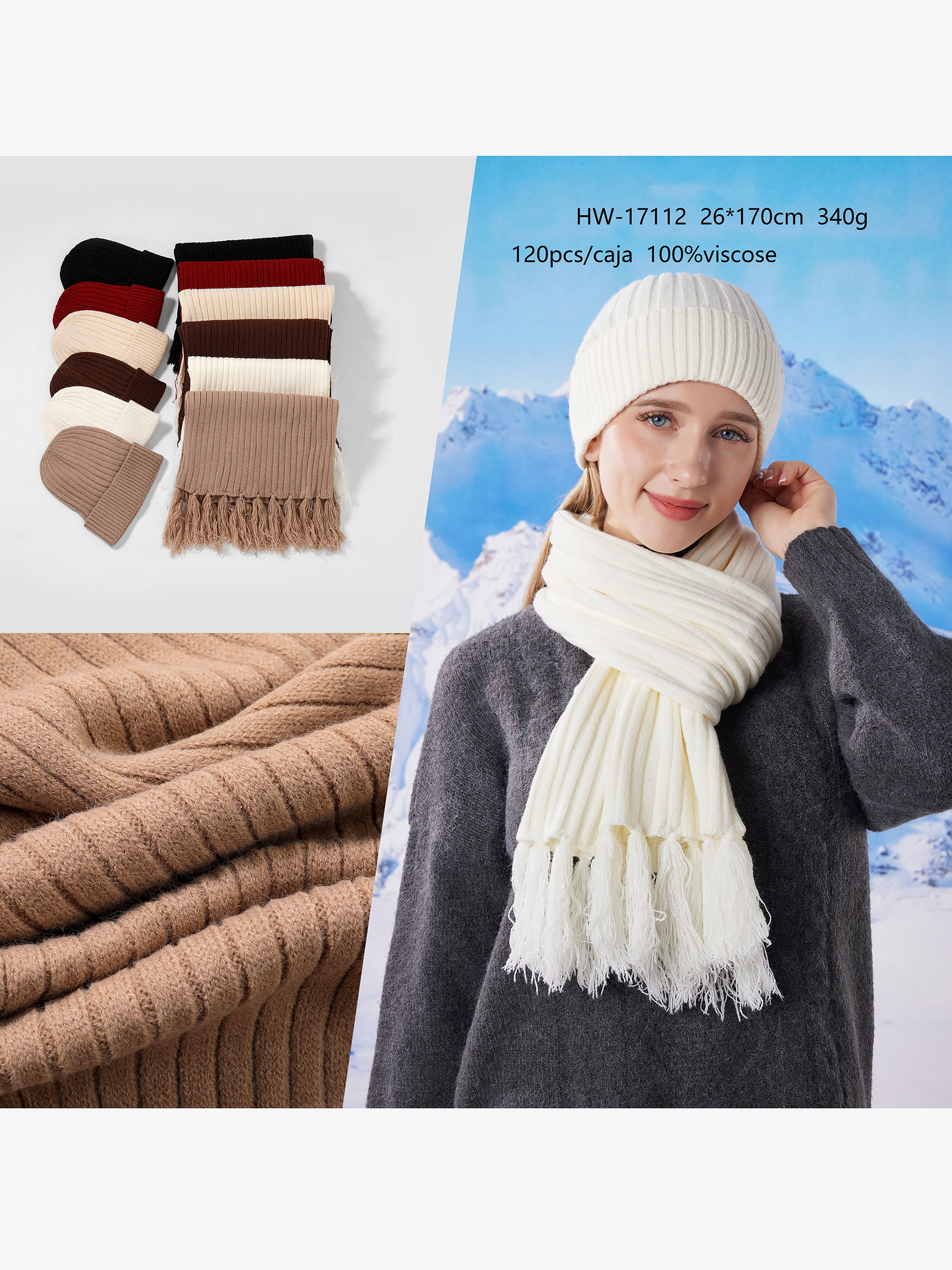 Detalles de conjunto bufanda punto canalé con flecos + gorro HY-HW-17112