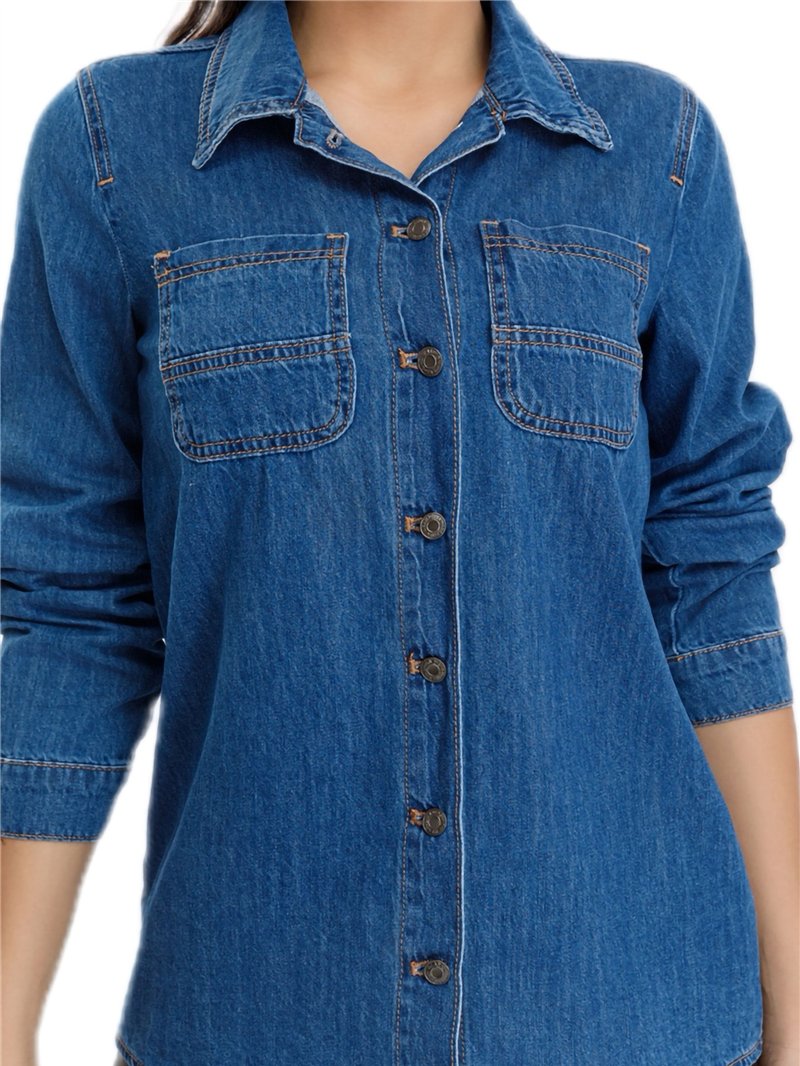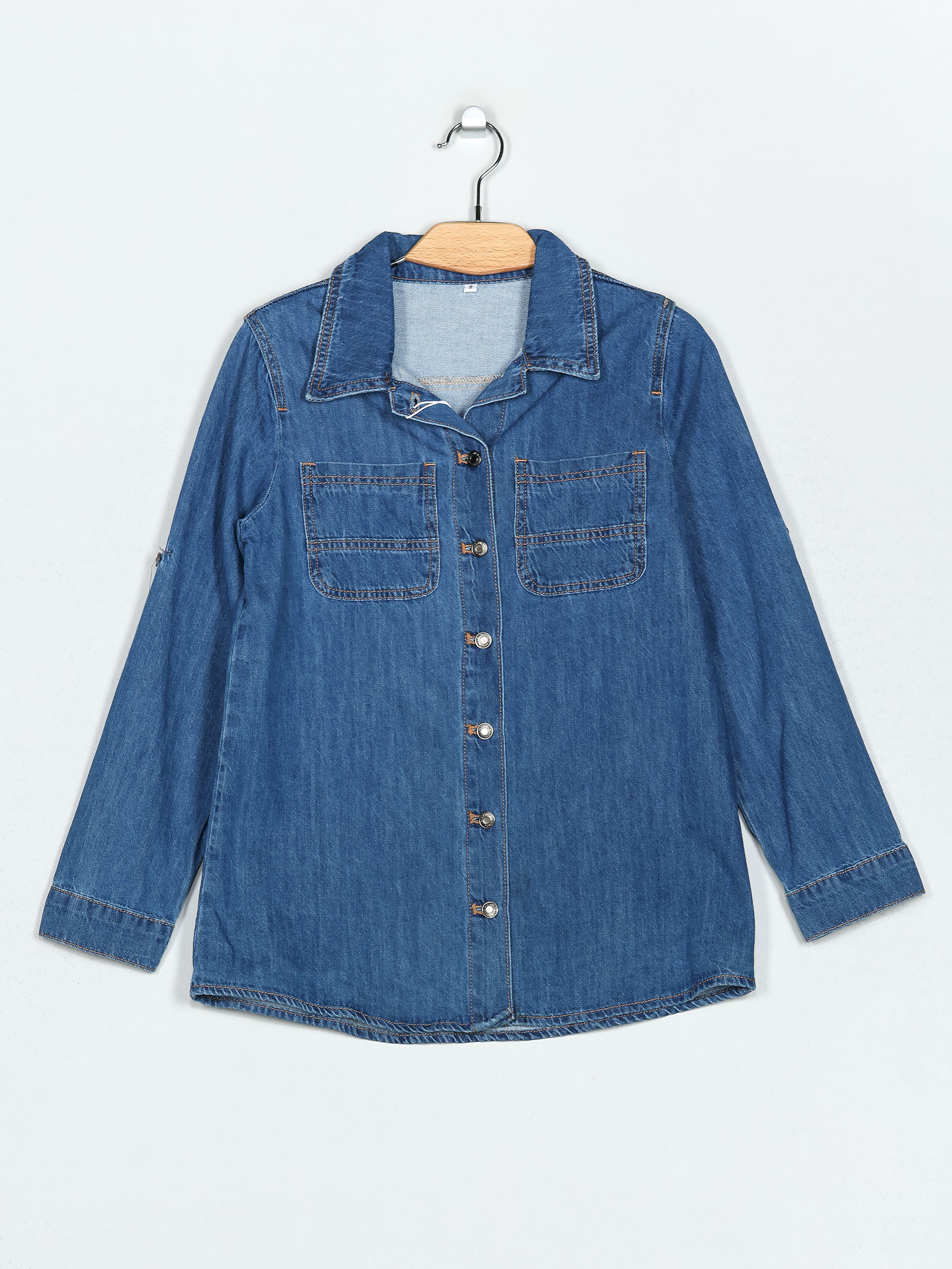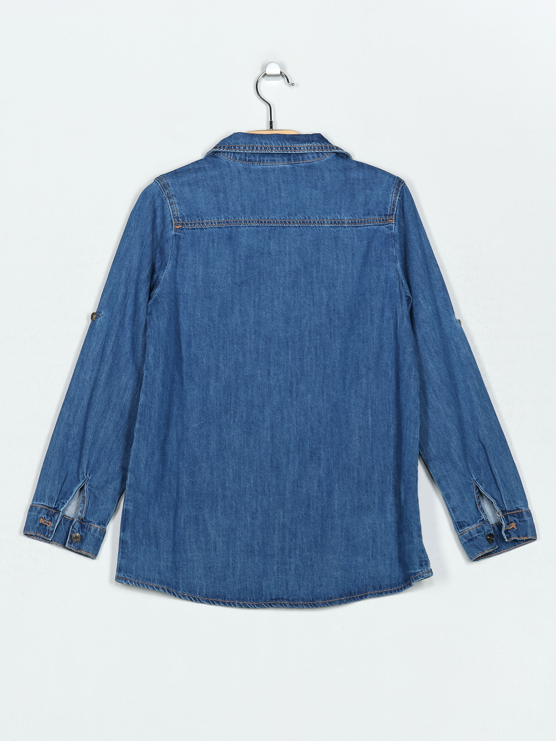 Camisa vaquera. Bolsillo de plastrón en pecho. Tejido no elástico. Cuello solapa. Manga larga. Cierre con botones.