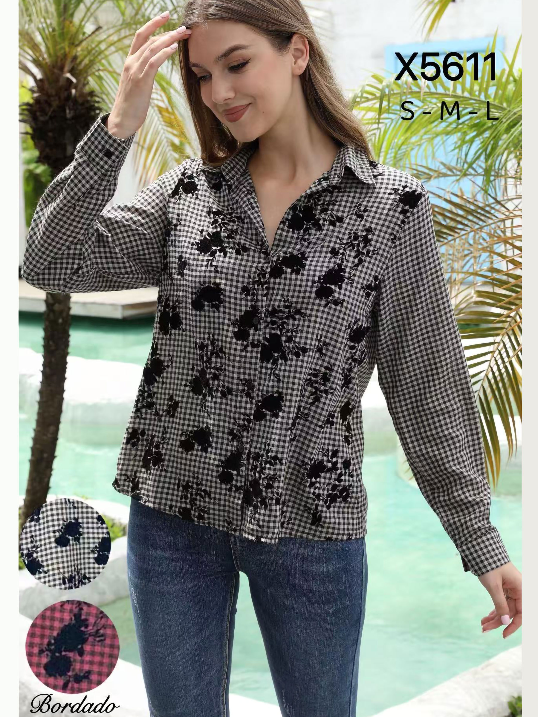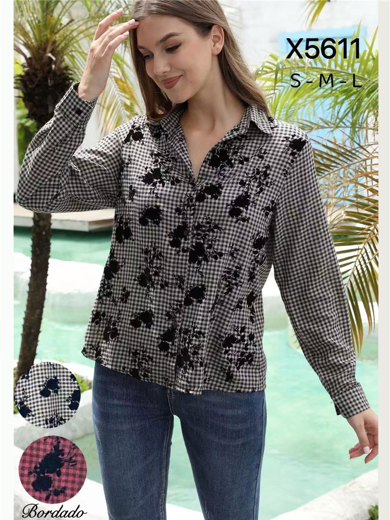 Detalles de camisa cuadro vichy flores bordadas DB-X5611