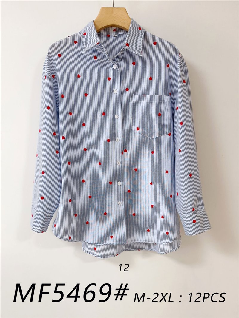 Camisa de manga larga a rayas con cuello clásico, bolsillo en el pecho y pequeños corazones bordados.