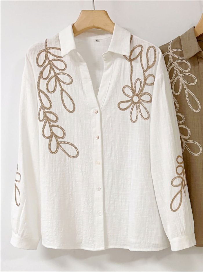 Camisa de manga larga con cuello clásico y cierre de botones, bordado floral en pecho y en mangas.