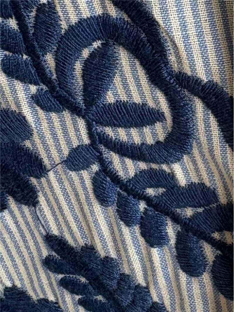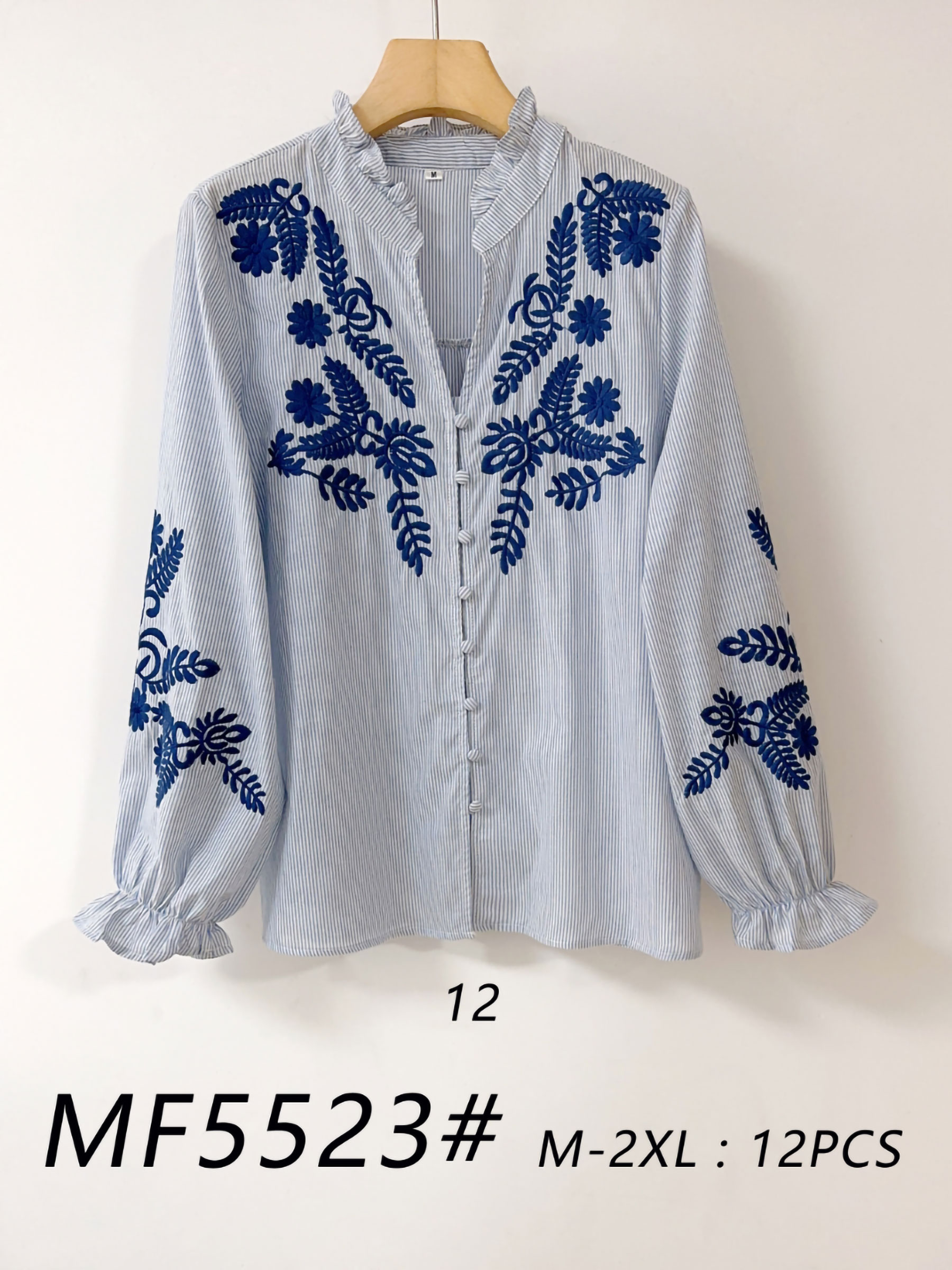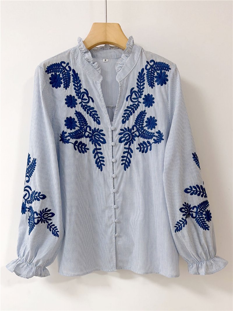 Camisa de rayas con cuello fruncido, cierre de botones y bordados florales en contraste. Puños fruncidos.