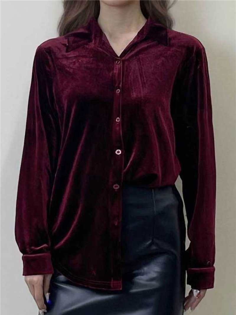 Camisa de terciopelo con cuello camisero, cierre de botones y manga larga.
