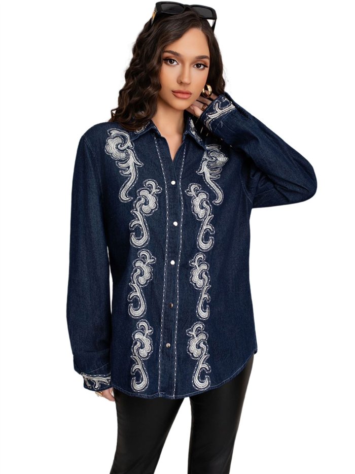 Camisa denim amplia bordada. Tejido no elástico. Cuello solapa. Manga larga. Cierre mediante botones de presión.
