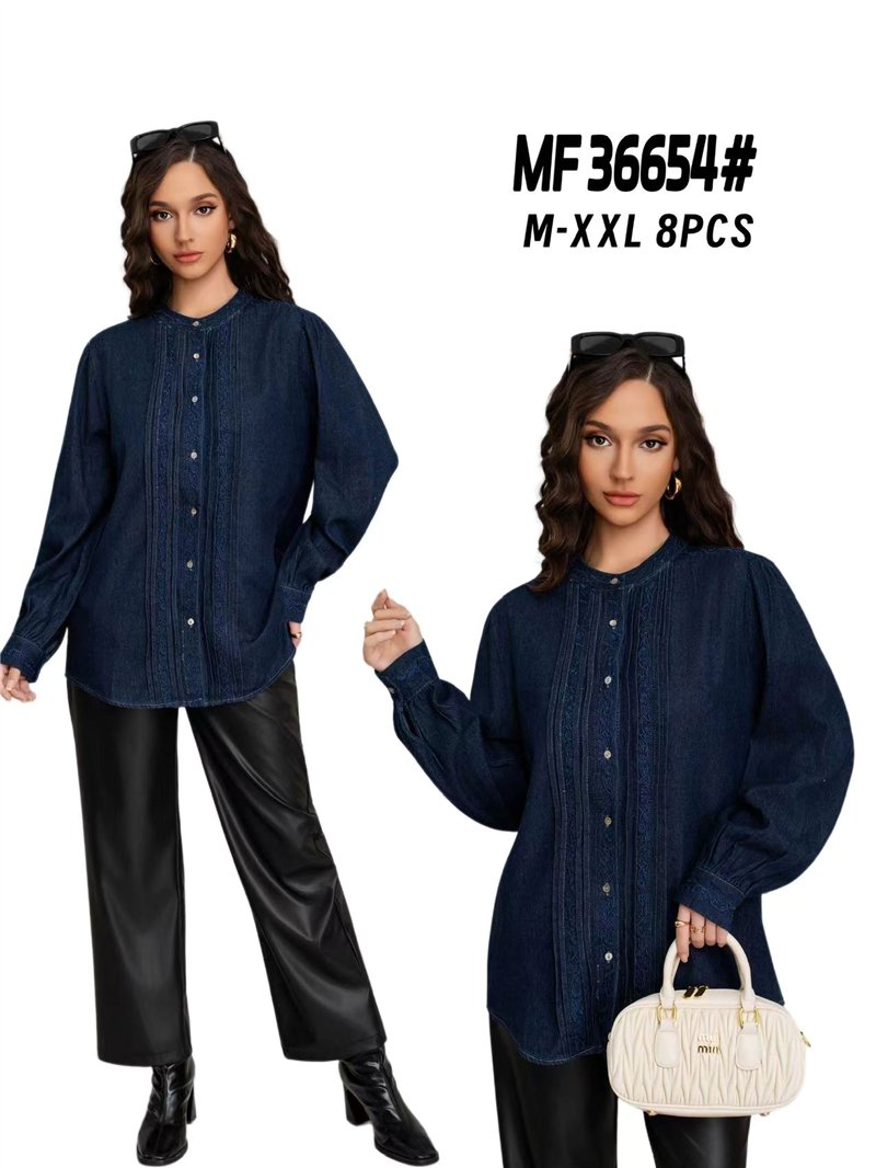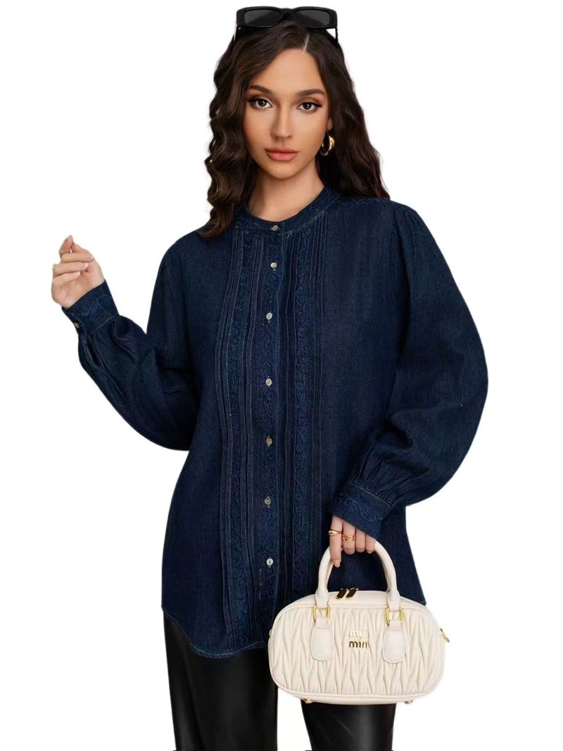 Camisa denim amplia bordada. Tejido no elástico. Manga larga. Cierre mediante botones.