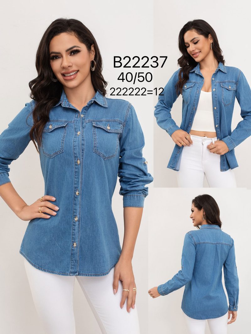 Camisa vaquera de manga larga con cuello camisero. Cierre de botones y bolsillos en el pecho. Trabilla con botón para remangar la manga.