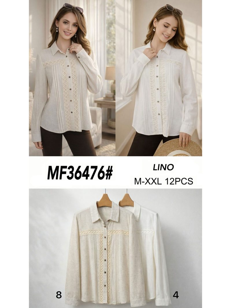 Camisa de efecto lino. Cuello solapa. Manga larga. Cierre de botones. Puntilla geométrica en el delantero.