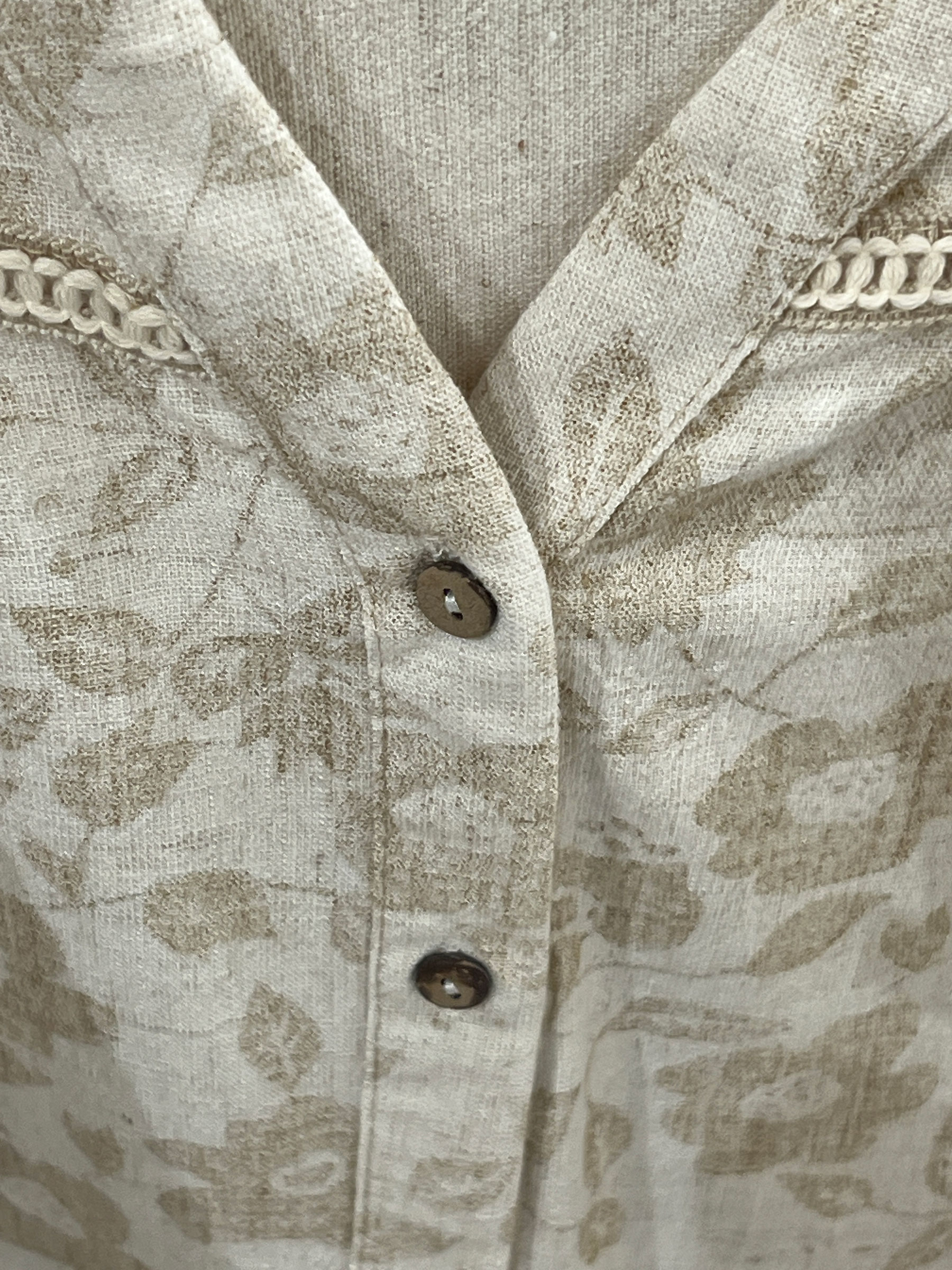 Camisa de efecto lino estampada. Cuello pico. Manga larga. Cierre de botones.