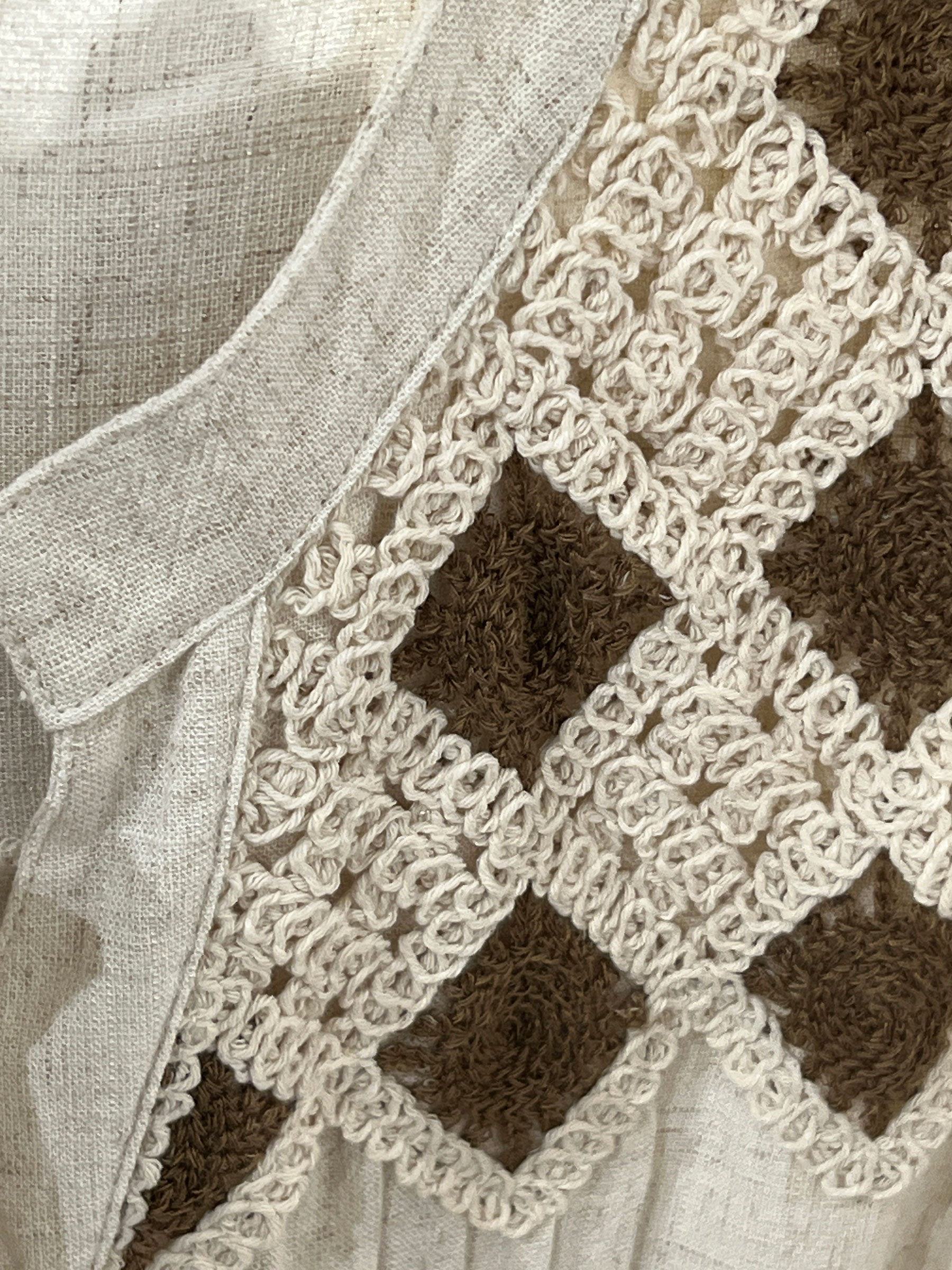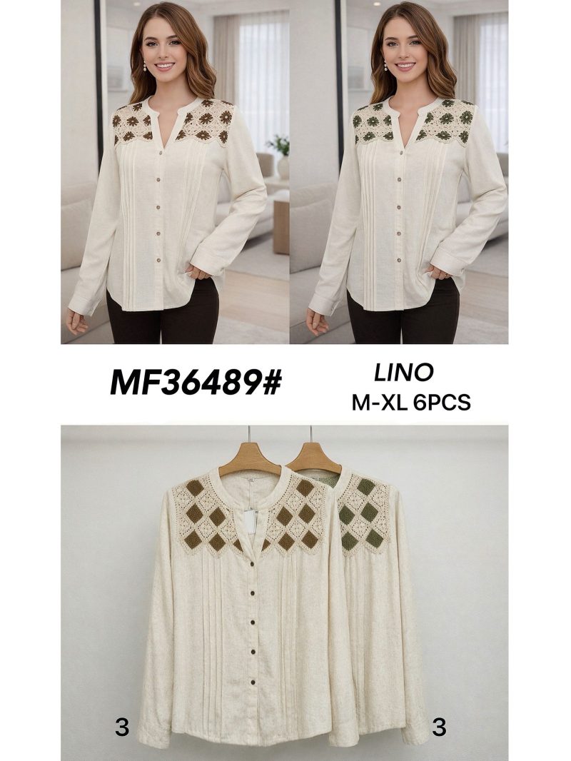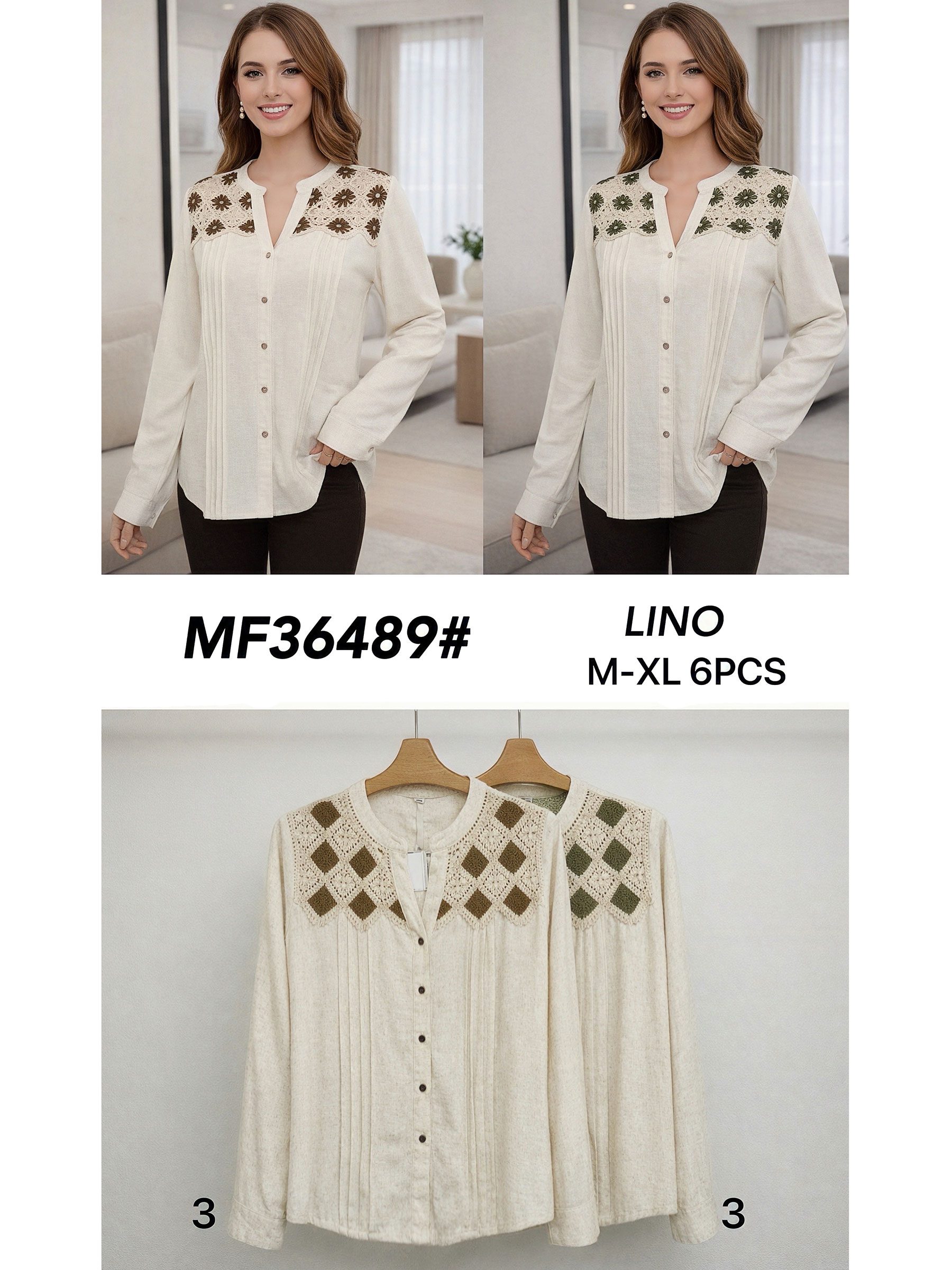 Camisa de efecto lino. Cuello pico. Manga larga. Cierre de botones. Detalle crochet en cuello y hombros.