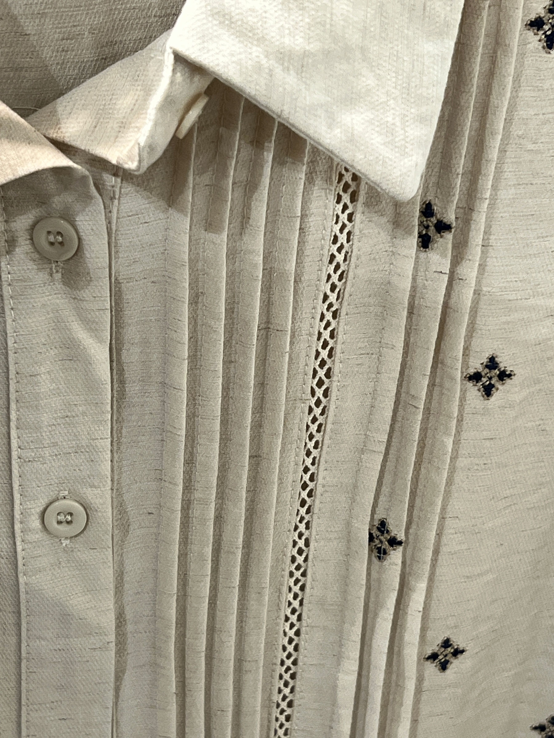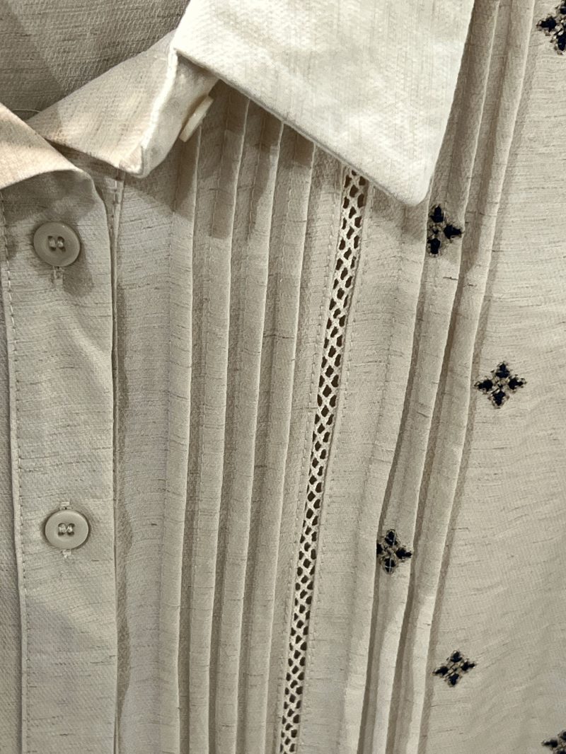 Camisa bordada con pliegues delanteras. Cuello solapa. Manga larga. Cierre de botones.