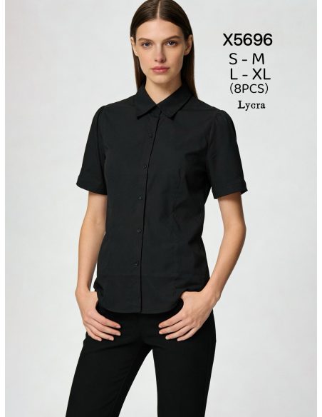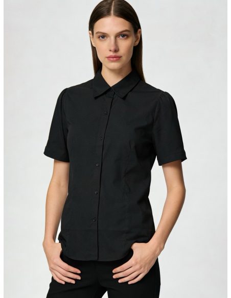 Camisa lycra. Cuello camisero. Cierre con botones. Manga corta. Pinzas en el delantero. Corte entallado.
