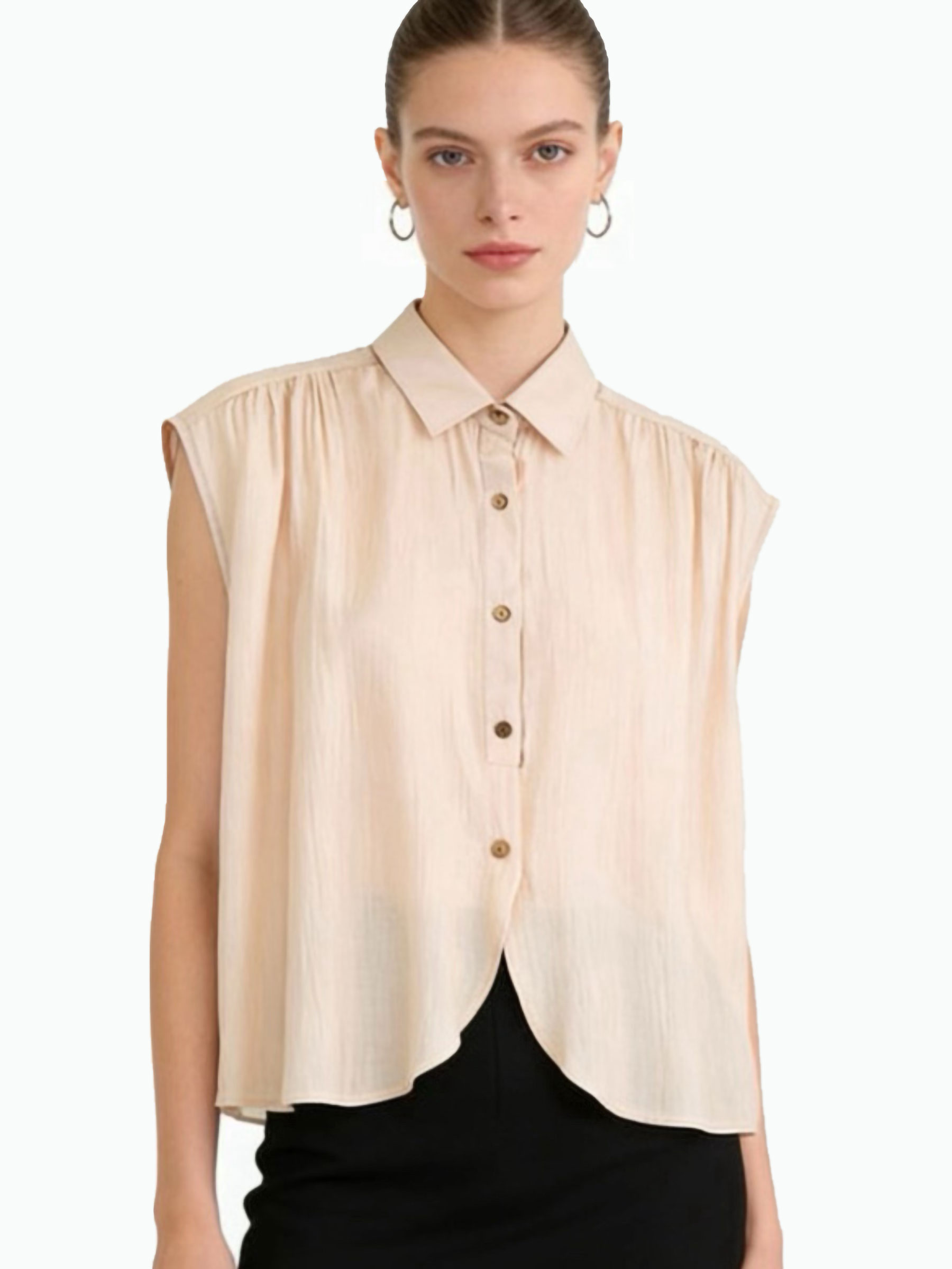 Camisa sin mangas. Talla grande. Hombro con frunces. Abertura frontal. Cierre frontal con botones.