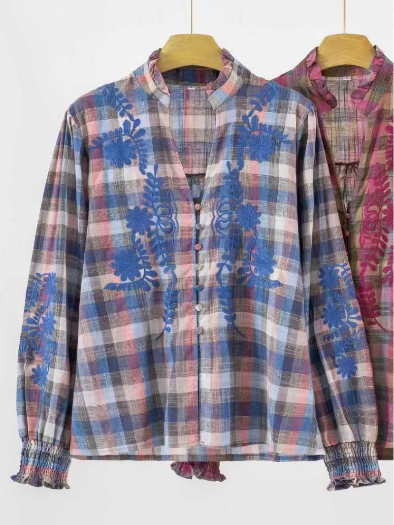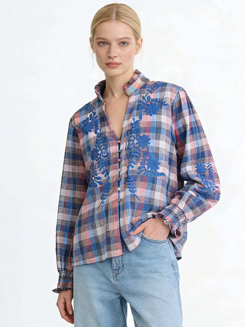 Camisa algodón. Estampado de cuadros. Bordado floral en contraste. Cuello con volante. Manga larga. Puño fruncido elástico. Cierre frontal con botones.