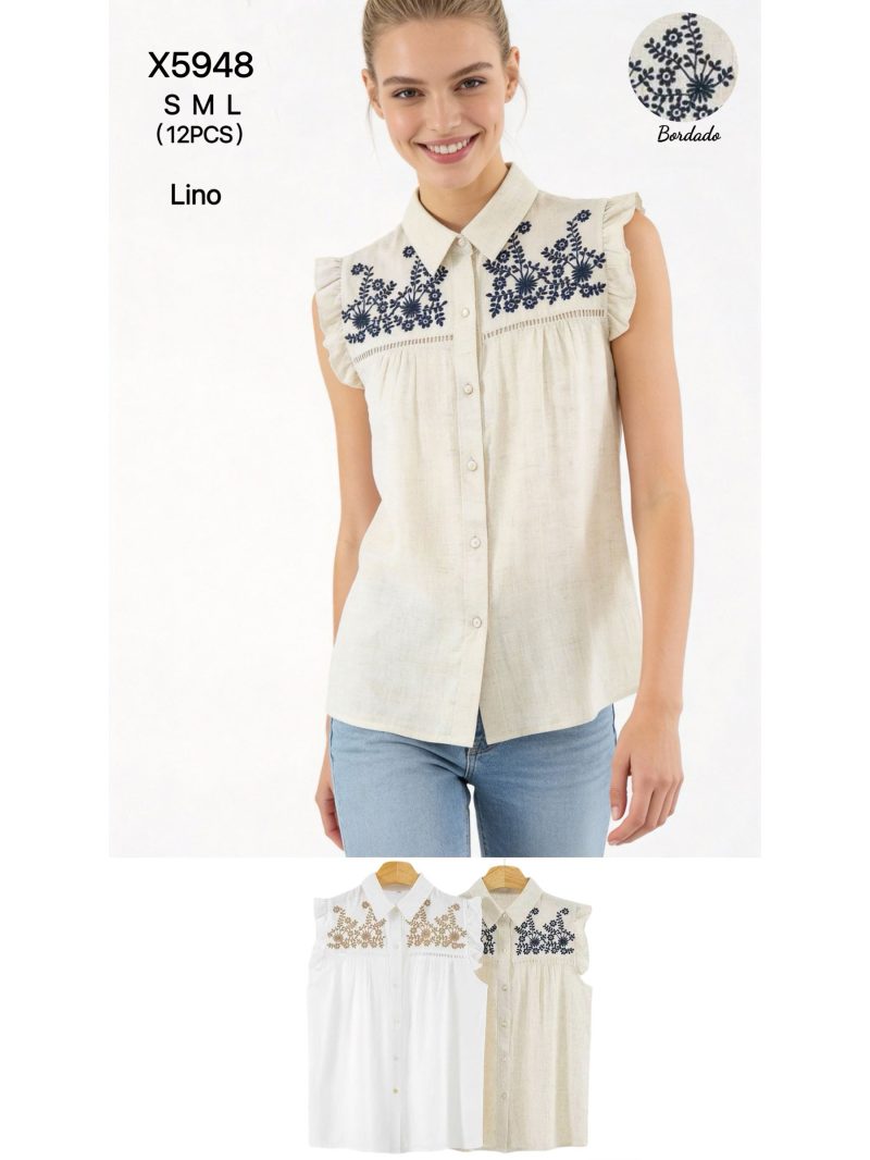 Camisa efecto lino. Bordado floral en canesú. Hombro con volante. Cuello camisero. Cierre mediante botones.