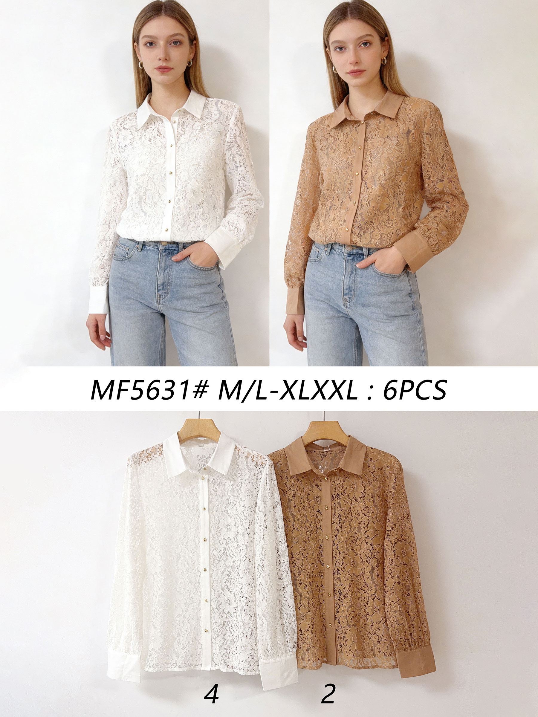 Camisa de encaje. Botones frontales. Manga larga con puño. Tejido semitransparente.