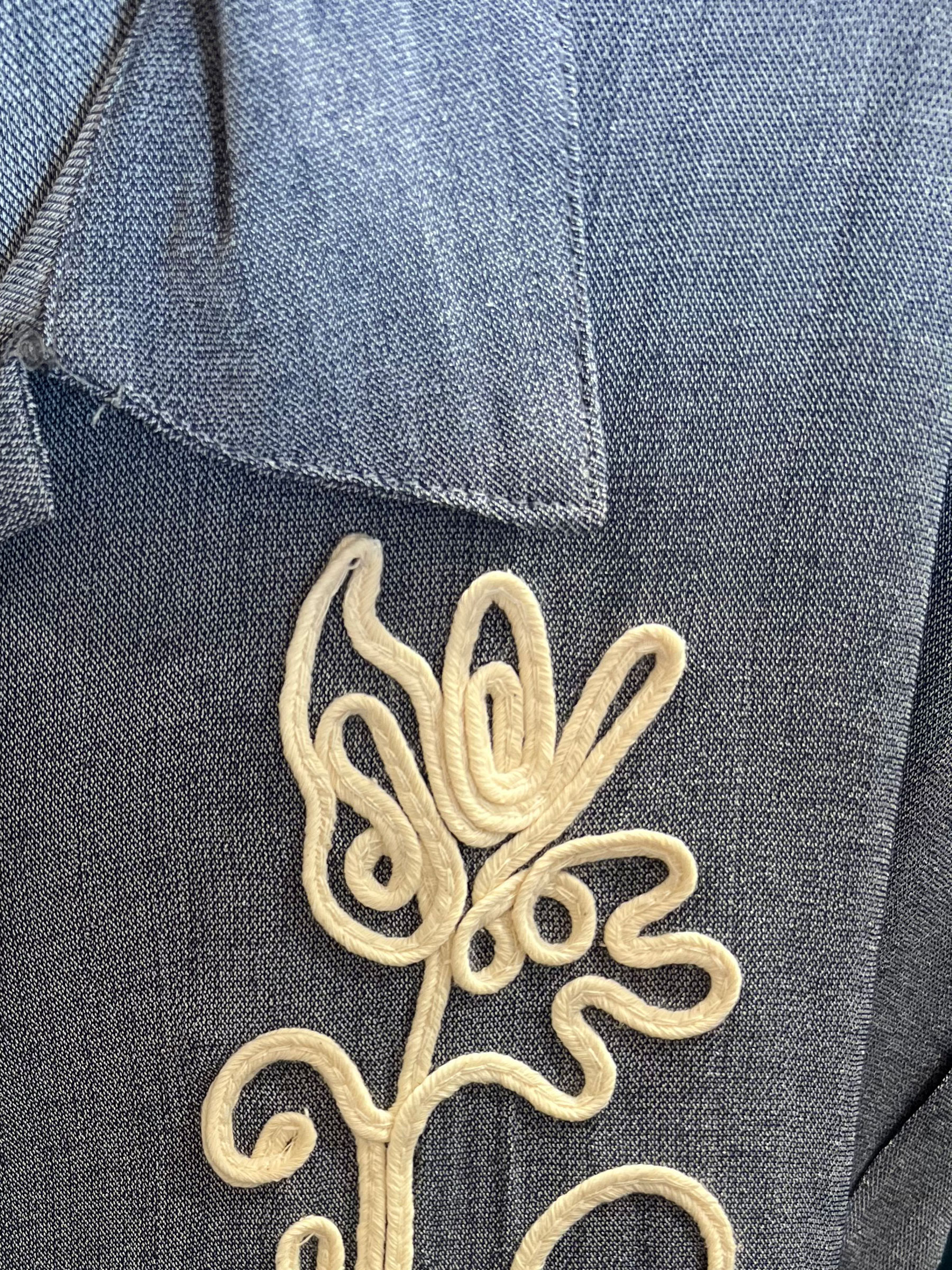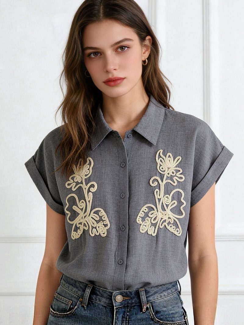 Camisa efecto denim. Bordado floral en contraste. Cuello camisero. Manga corta con vuelta. Cierre frontal con botones.