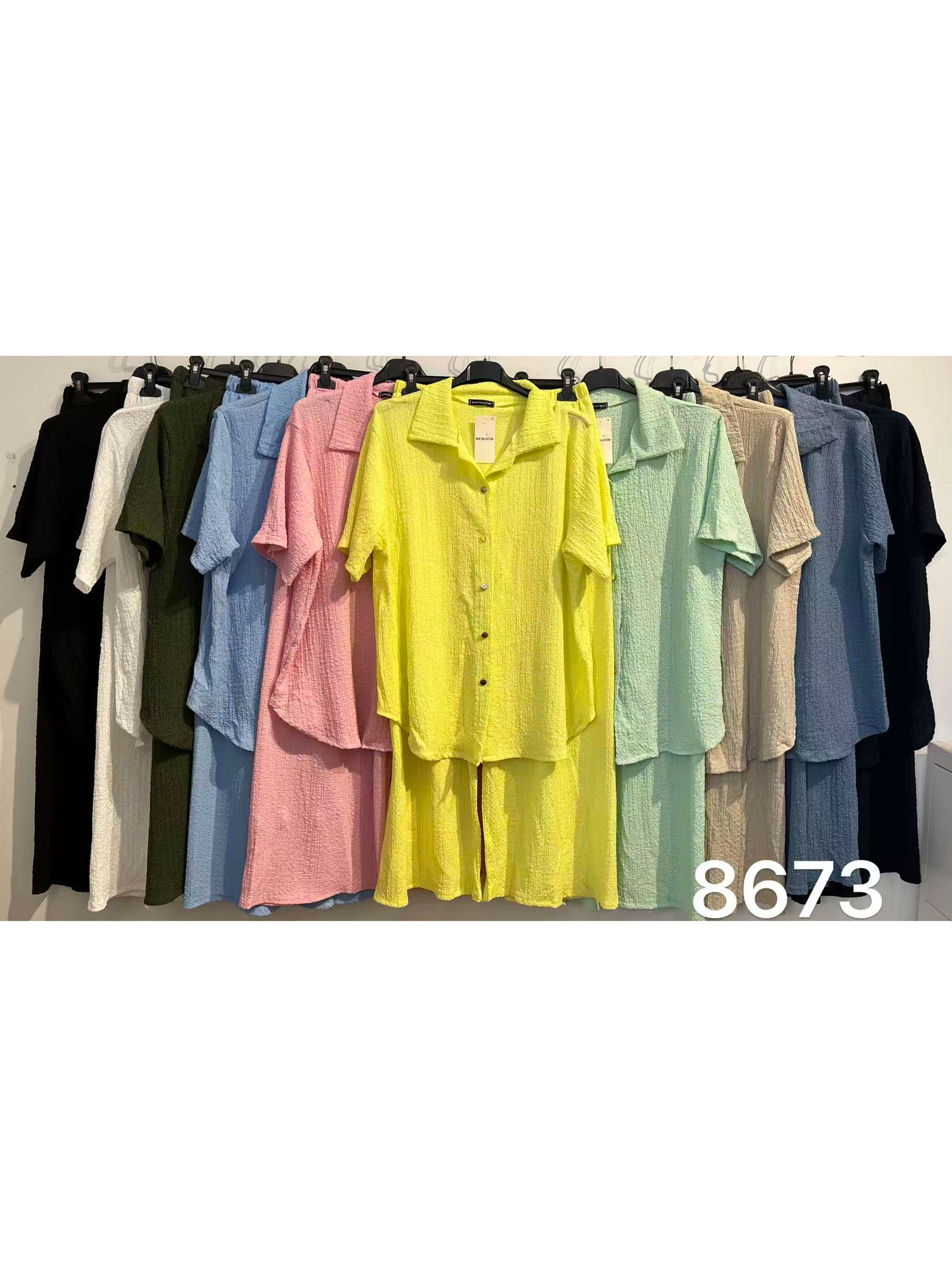 Mín. 6 Camisas Conjunto calado camisa nudo + falda midi MF-18095 Conjunto de dos piezas. Camisa bordada. Cuello solapa. Manga corta. Cierre mediante botones. Nudo frontal. Falda midi bordada. Cintura elástica.Colección: Primavera/Verano 2026 Ver precio