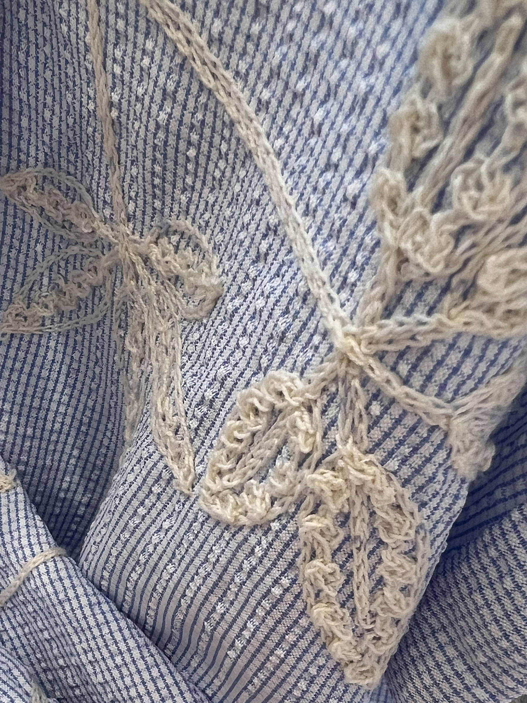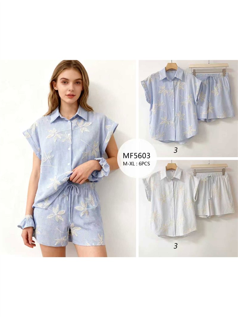 Conjunto de dos piezas. Camisa bordada de hojas. Cuello solapa. Manga corta. Short con cintura elástica y cordón.