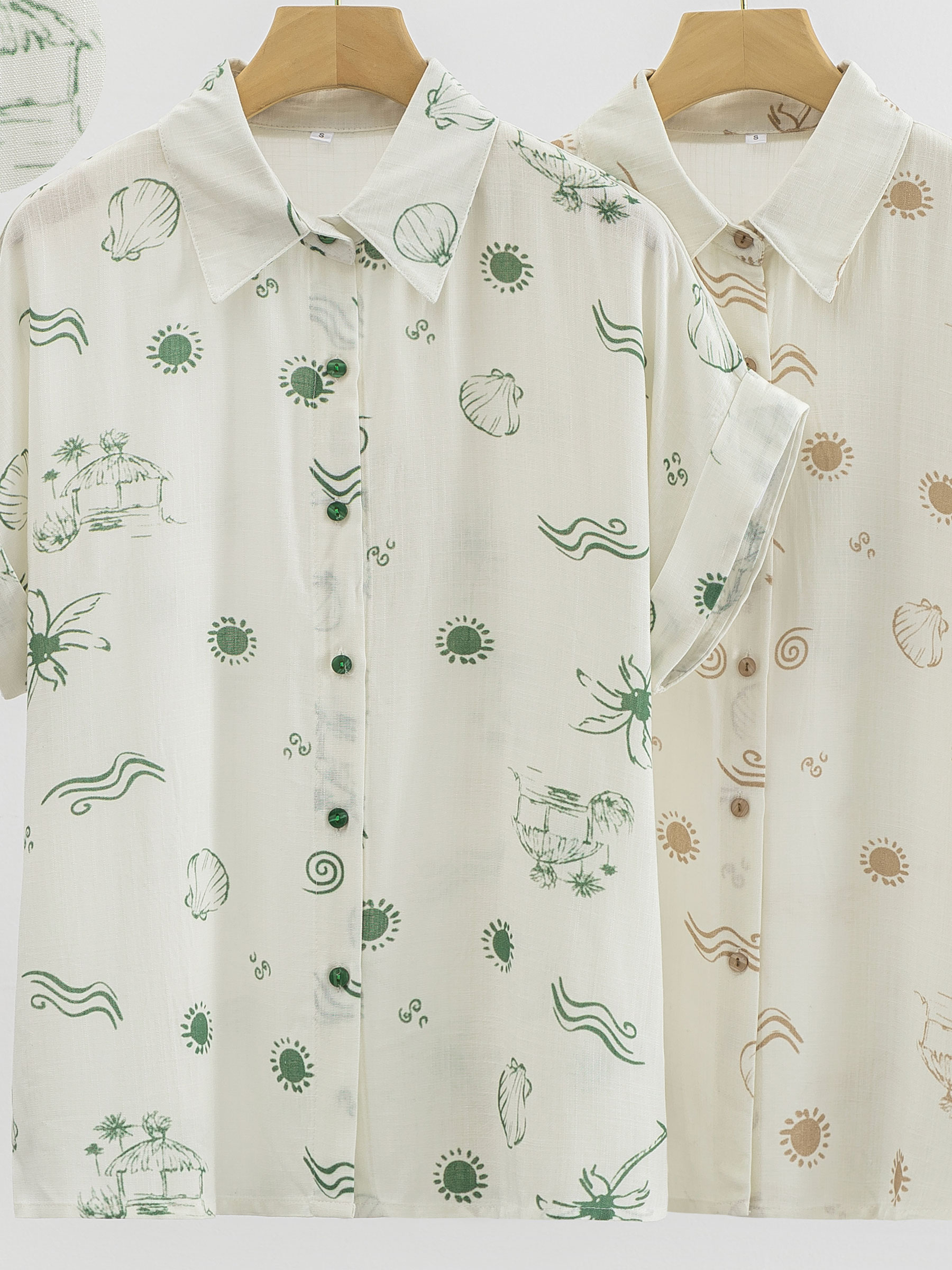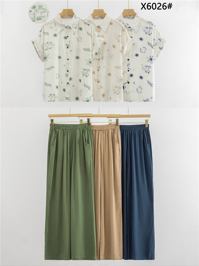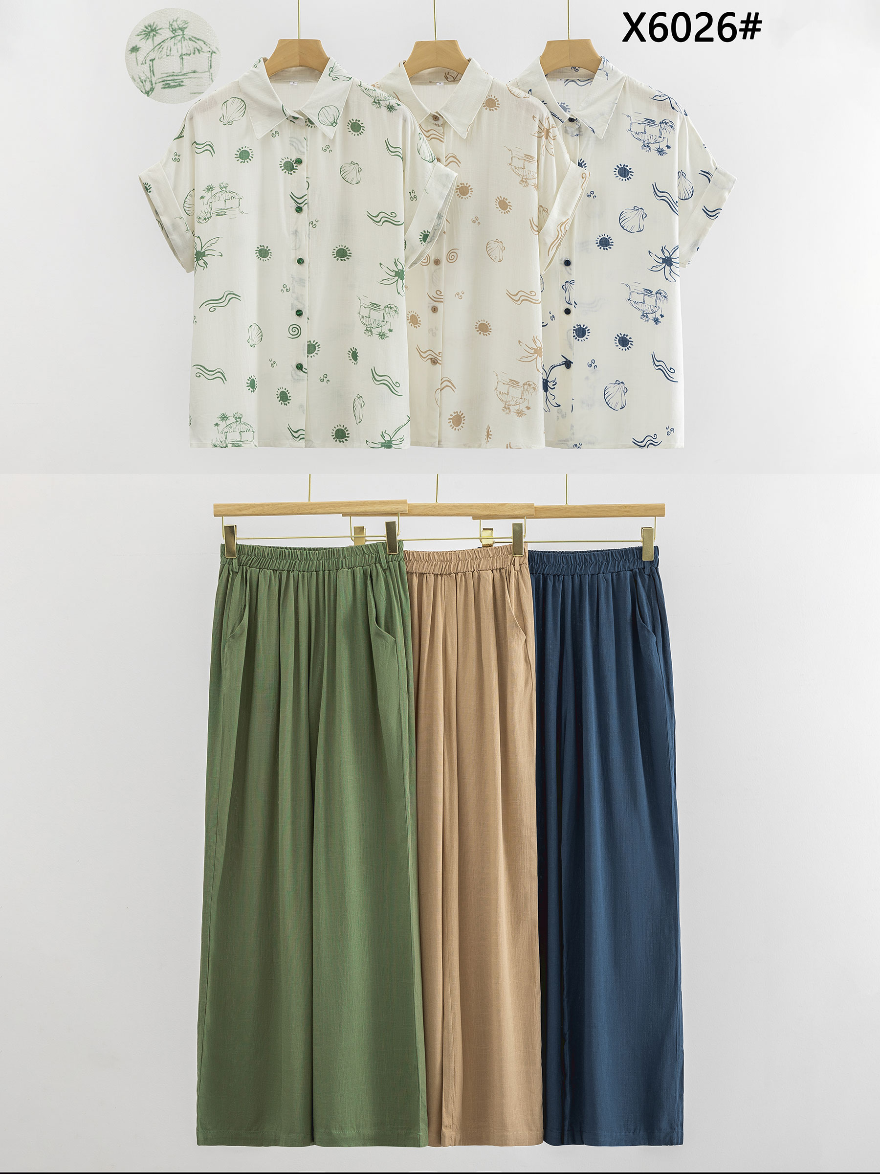 Conjunto de dos piezas. Camisa estampada. Manga corta. Pantalón palazzo. Cinturón incluido.