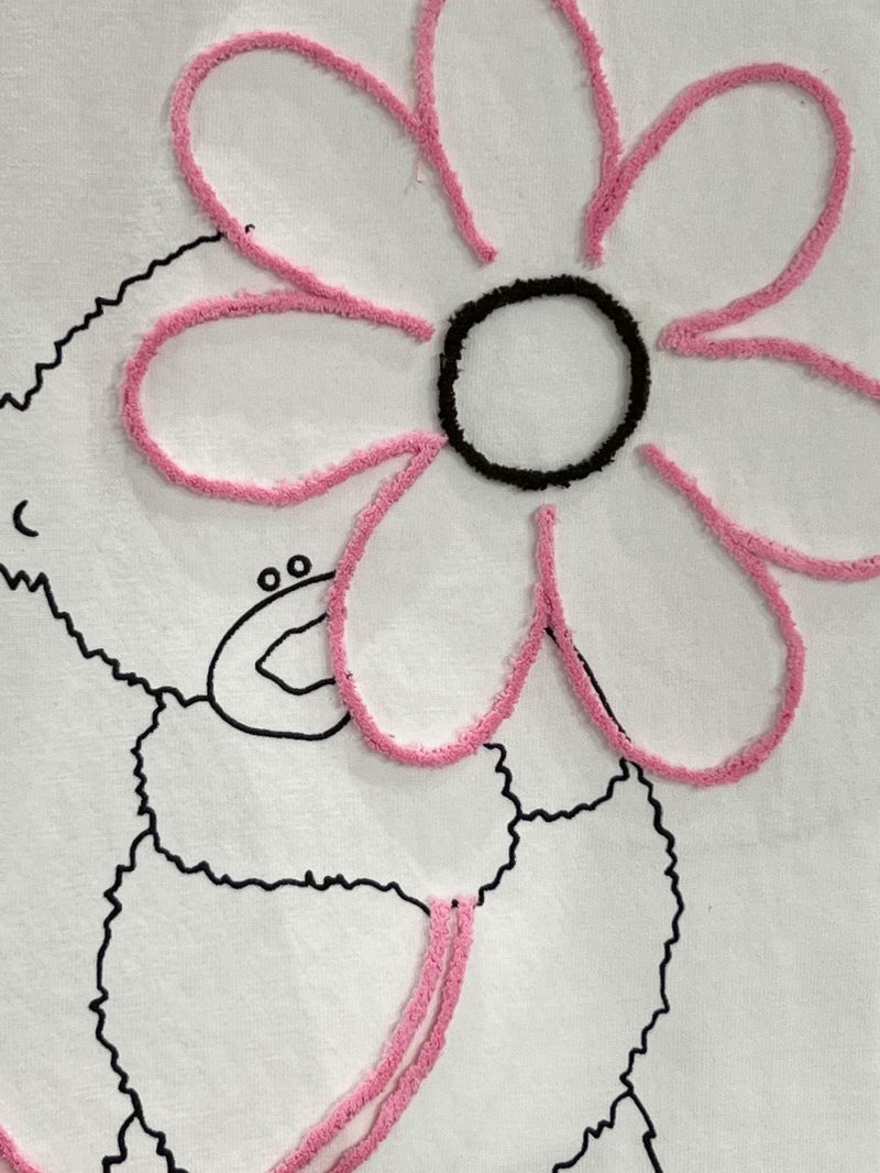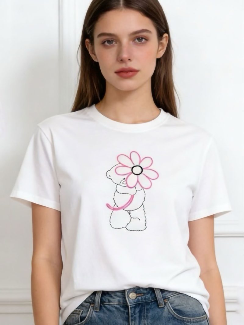 Camiseta amplia estampada osito. Motivo flor frontal. Cuello redondo. Manga corta. Tejido elástico.