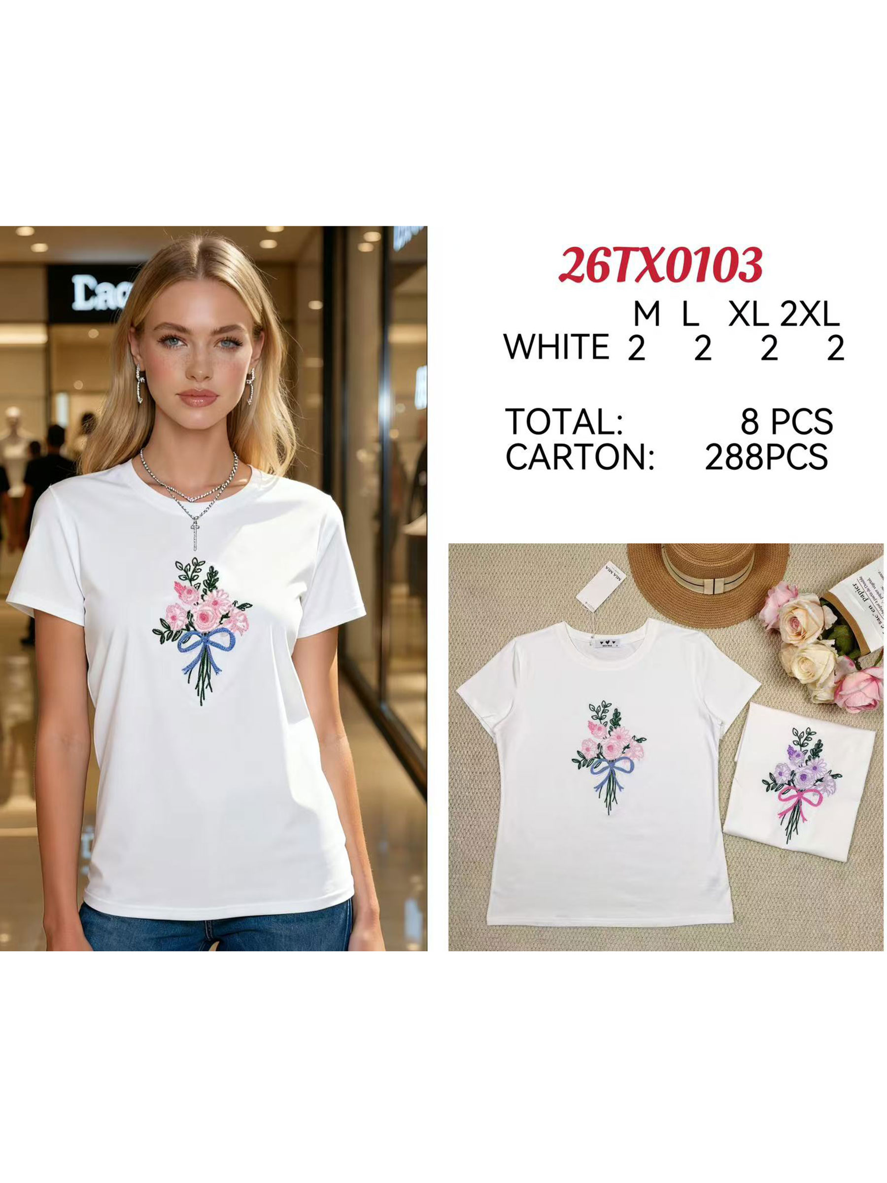 Camiseta bordada. Cuello redondo. Manga corta. Motivo ramo floral con lazo.