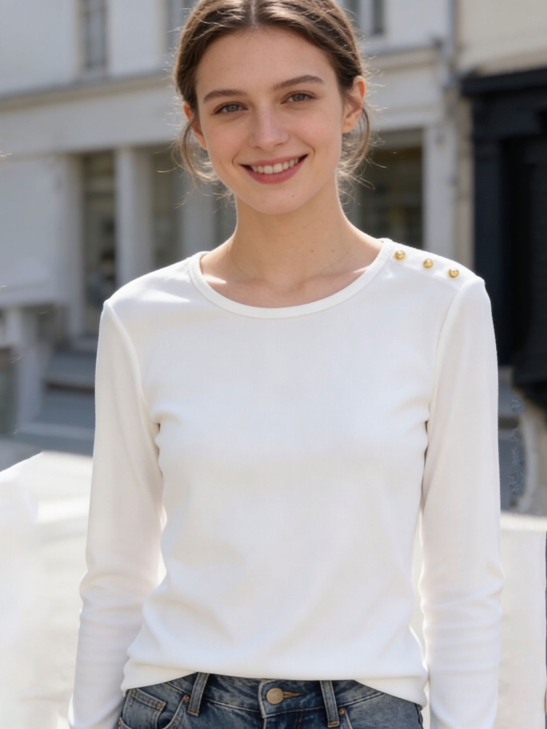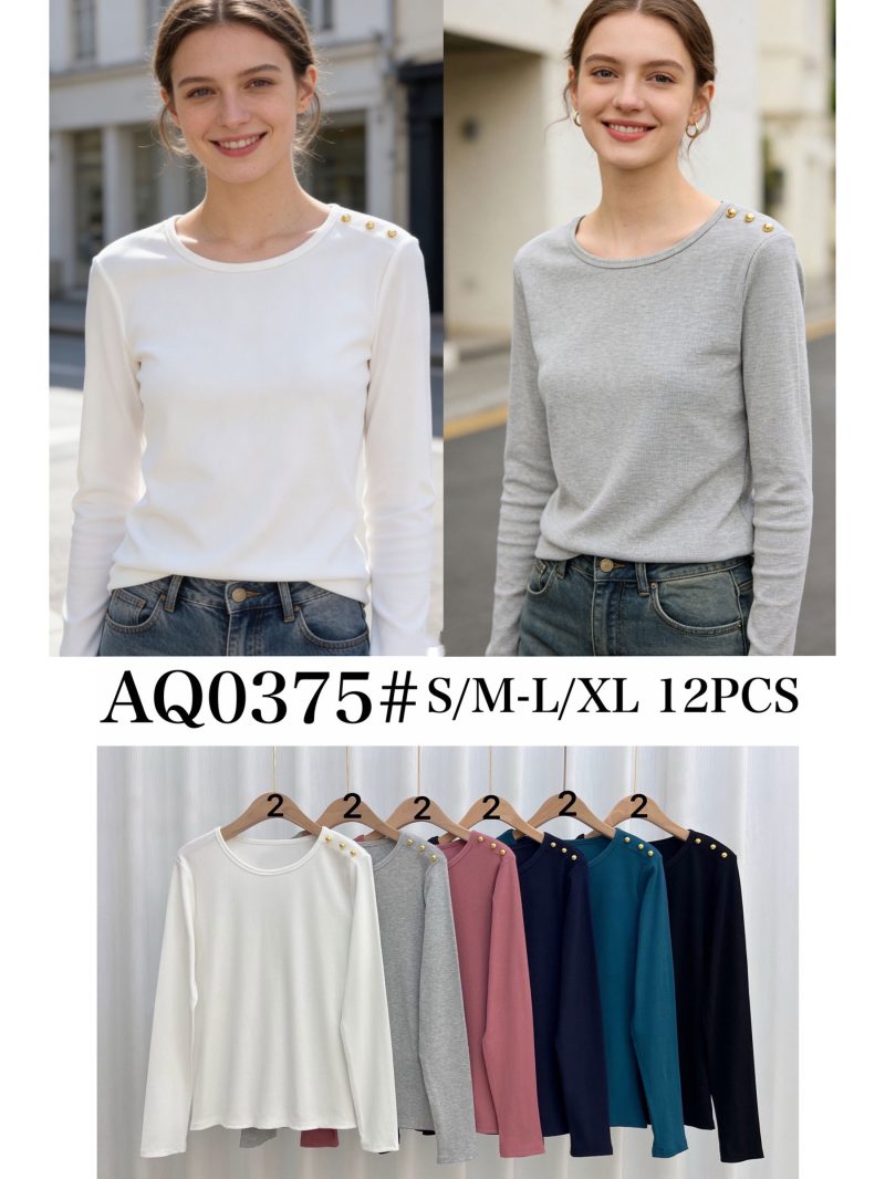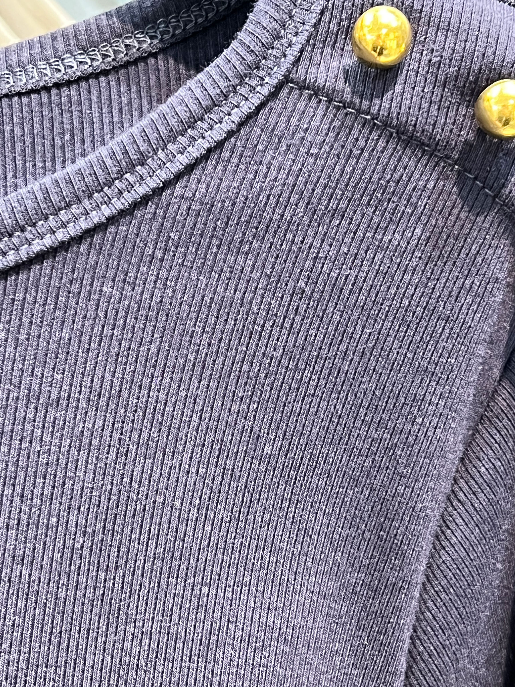 Camiseta lisa. Botones metálicos en hombros. Cuello redondo. Manga larga. Tejido elástico.