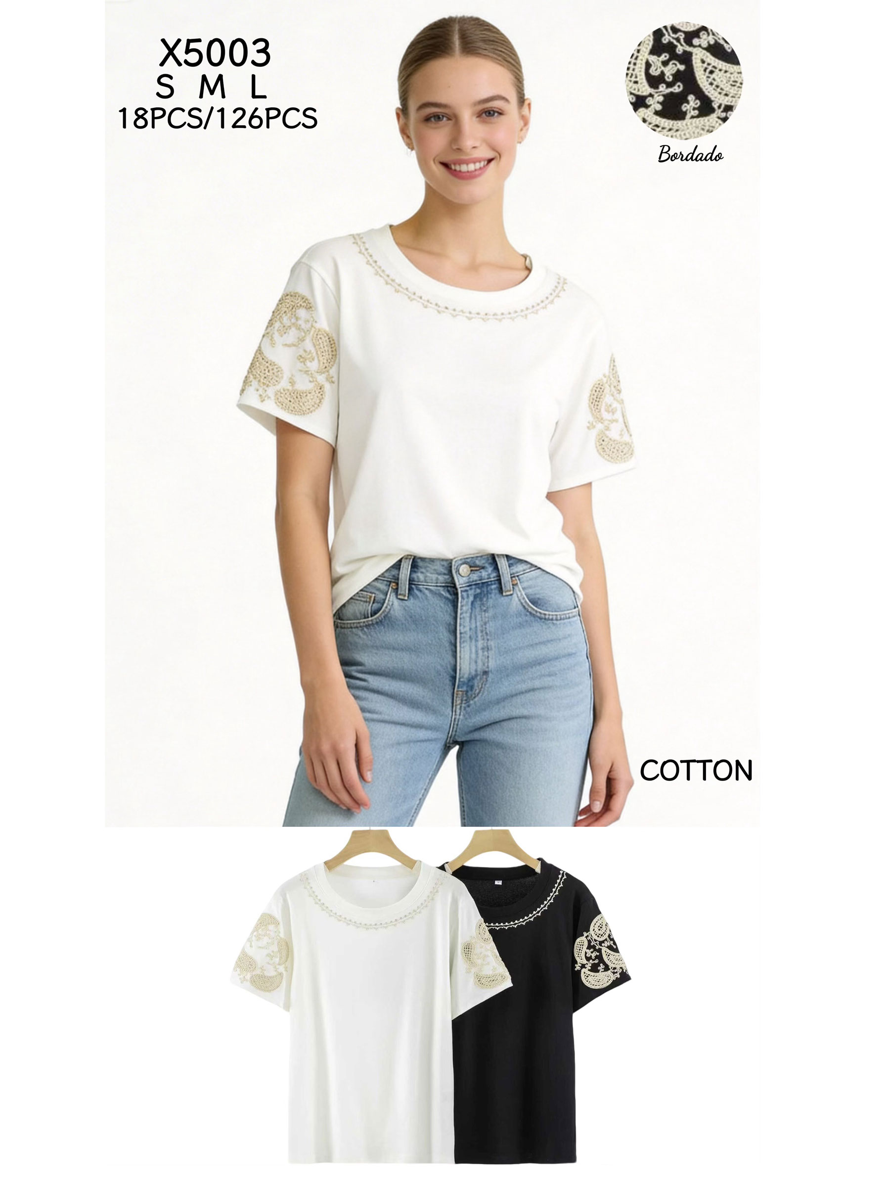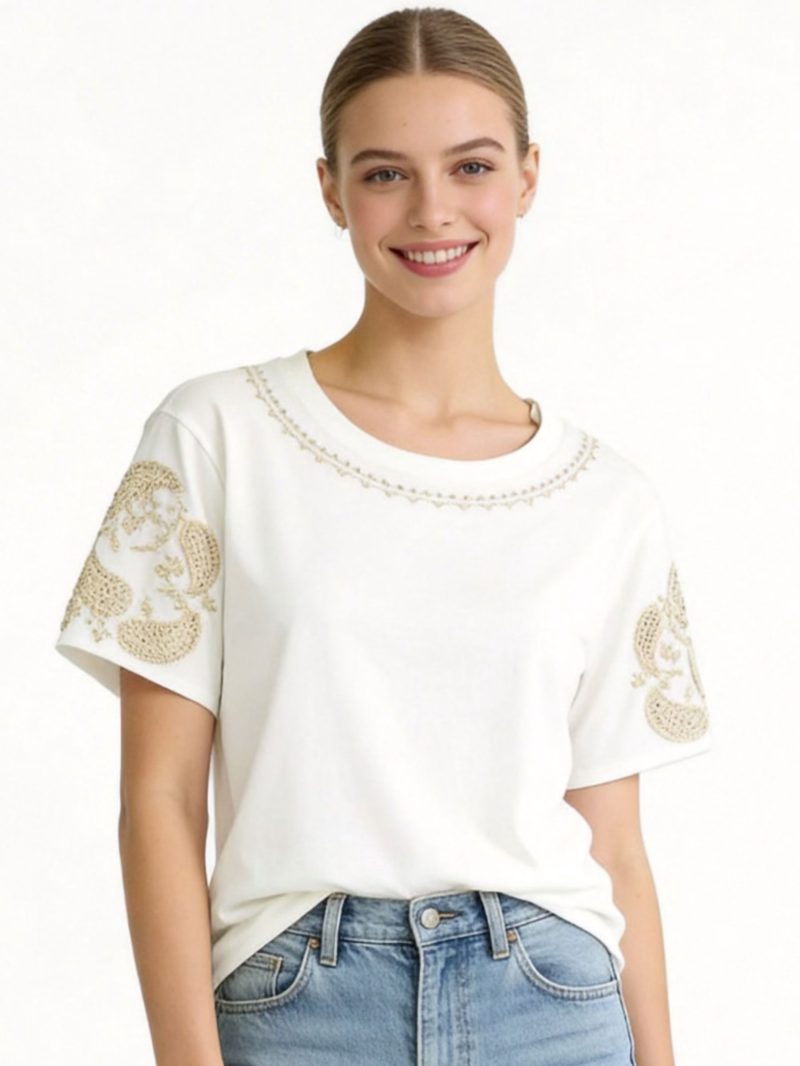 Mín. 8 Camisetas Camiseta cuello pico bordado en mangas JS-ANE8820 Colección: Primavera/Verano 2026 Ver precio