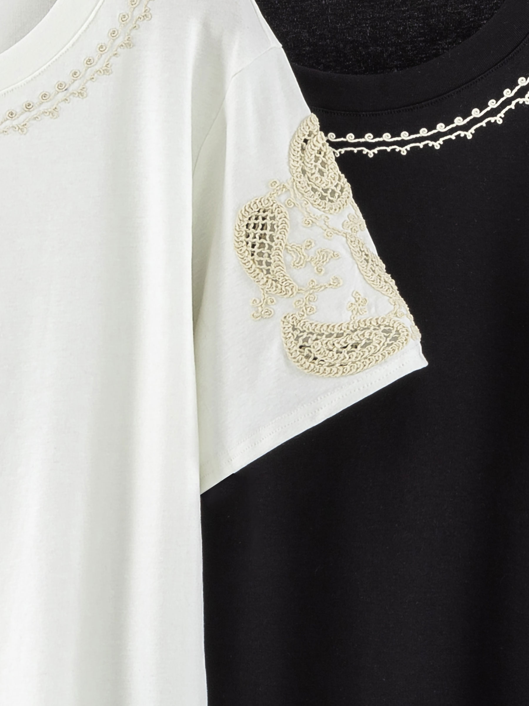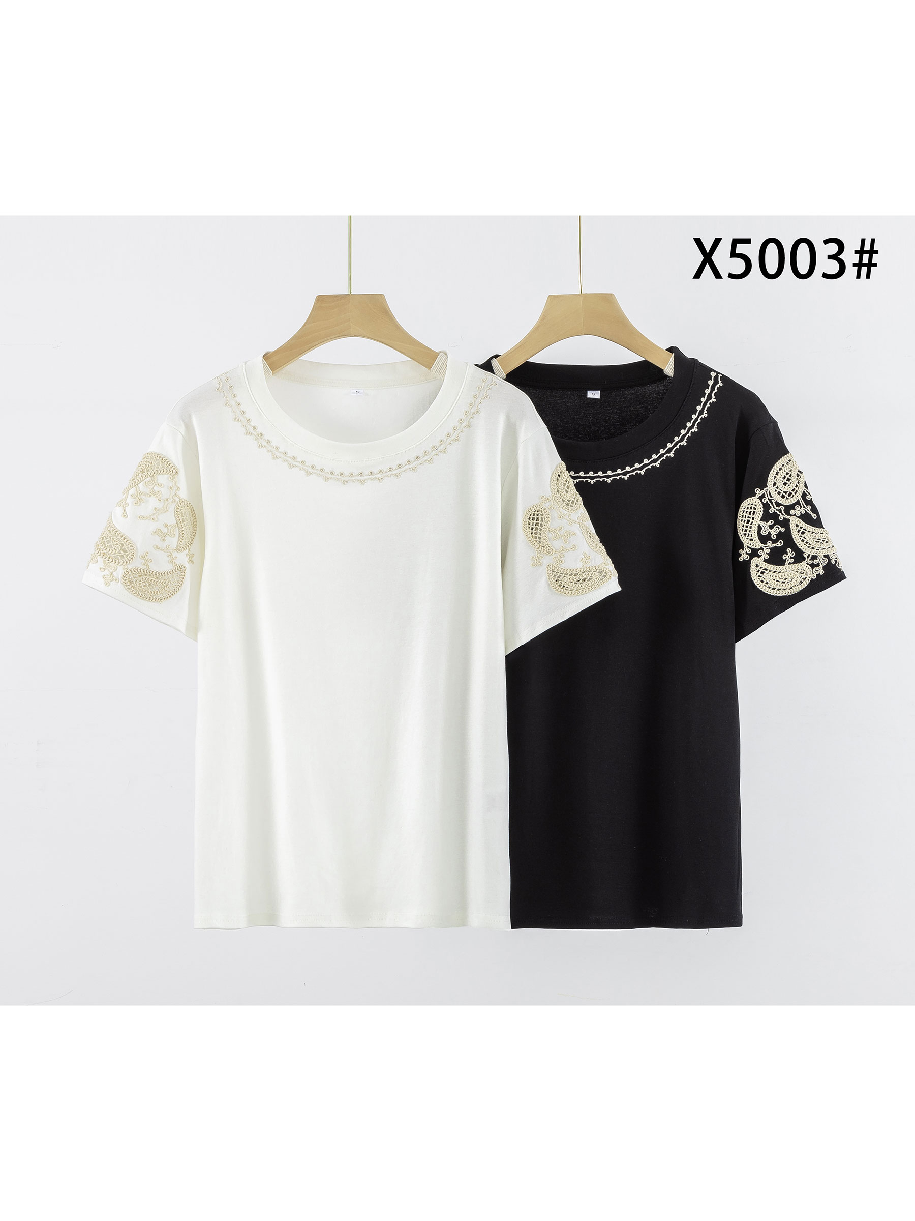 Mín. 8 Camisetas Camiseta algodón escote en v y encaje bordado DB-Y119 Camiseta de algodón con escote en v y detalle de encaje bordado en los hombros. Ver precio