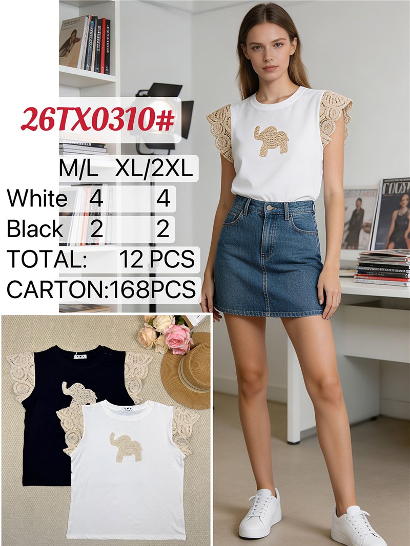 Top manga crochet elefante bordado