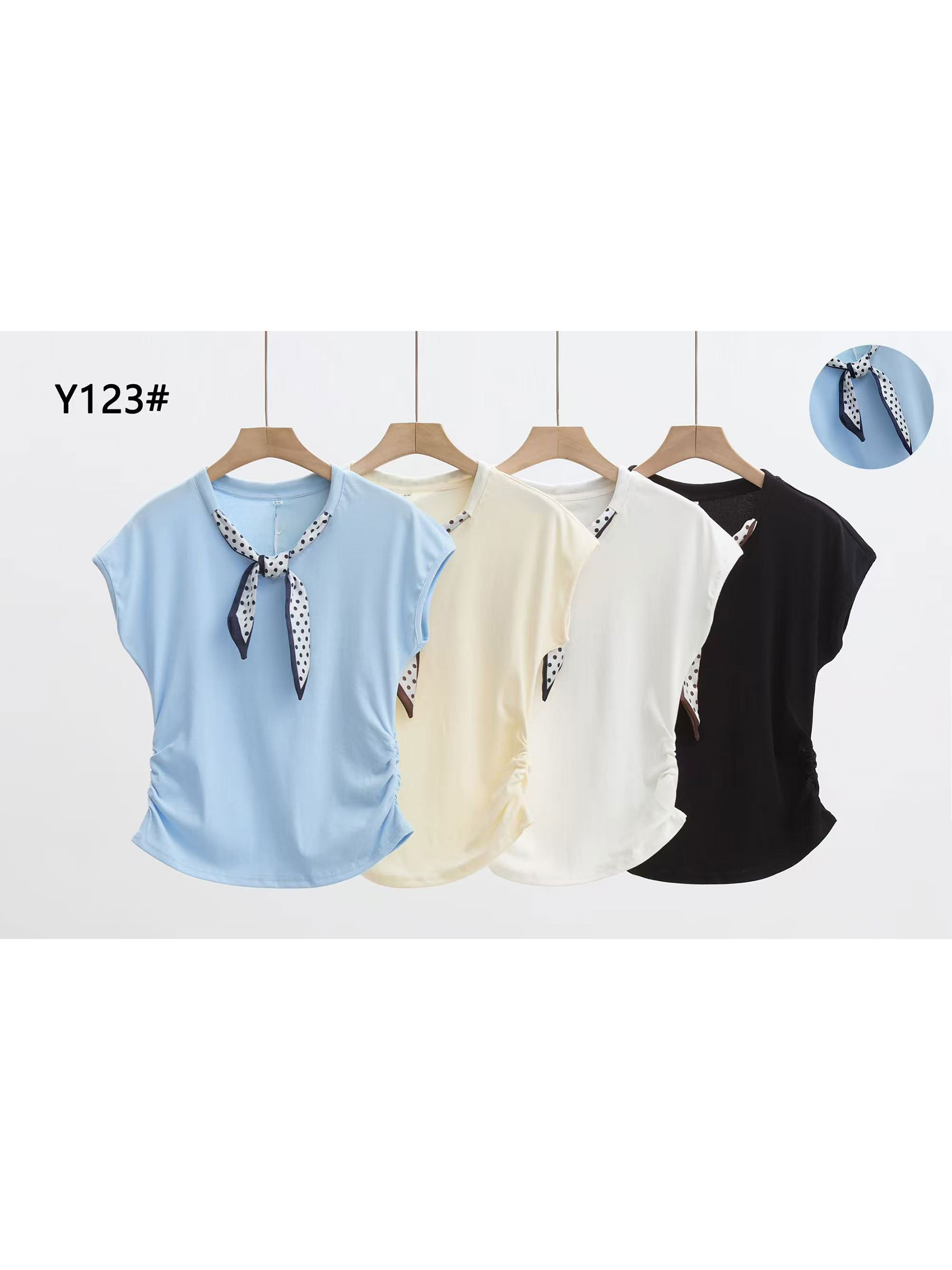Camiseta lisa. Detalle pañuelo de lunares en escote. Cuello redondo. Manga sisa. Frunces laterales. Tejido algodón.