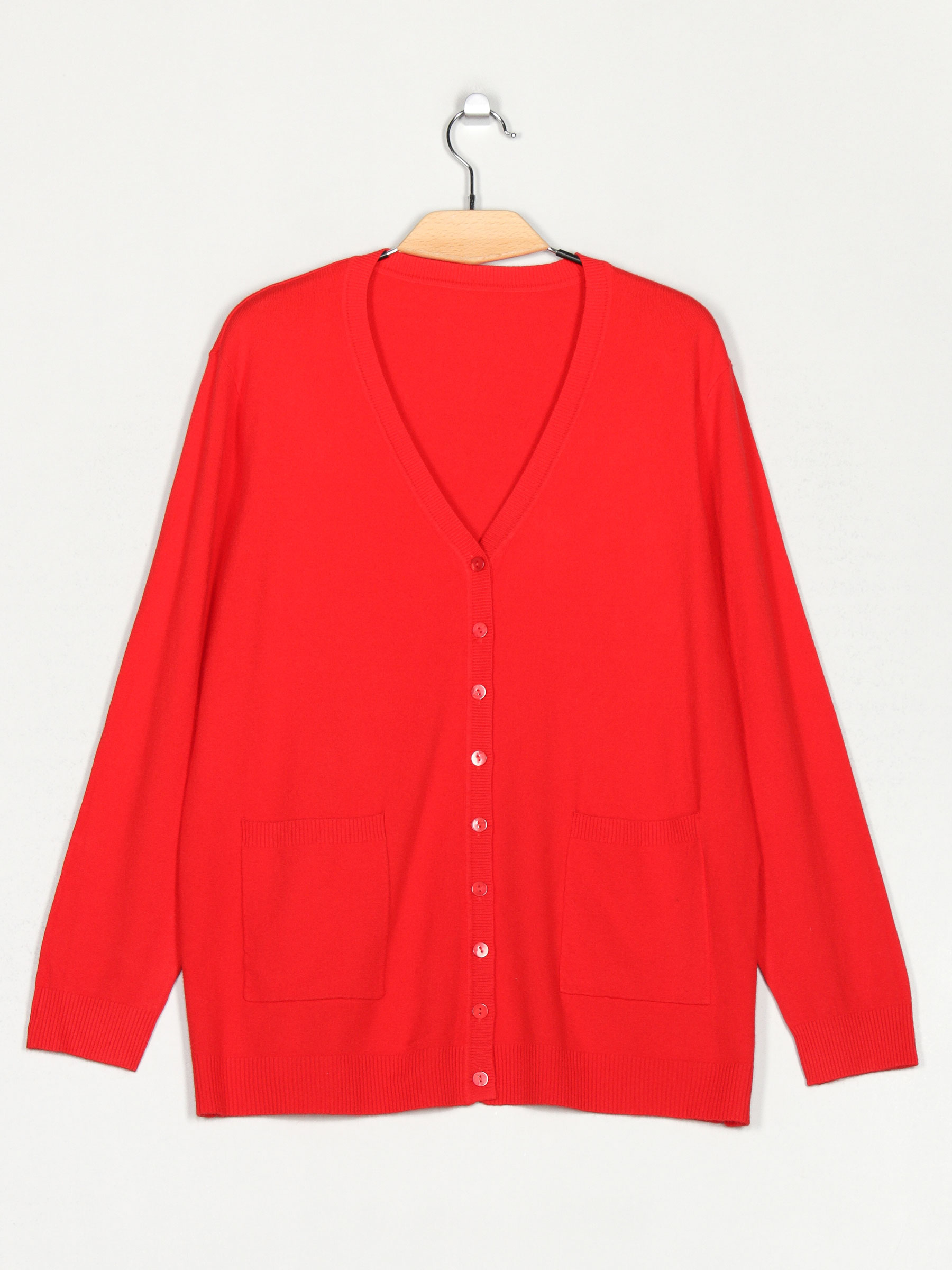 Chaqueta de punto fino. Tacto suave. Acabados en rib. Talla grande. Bolsillos delanteros de plastrón. Cuello pico. Cierre mediante botones. Manga larga.
