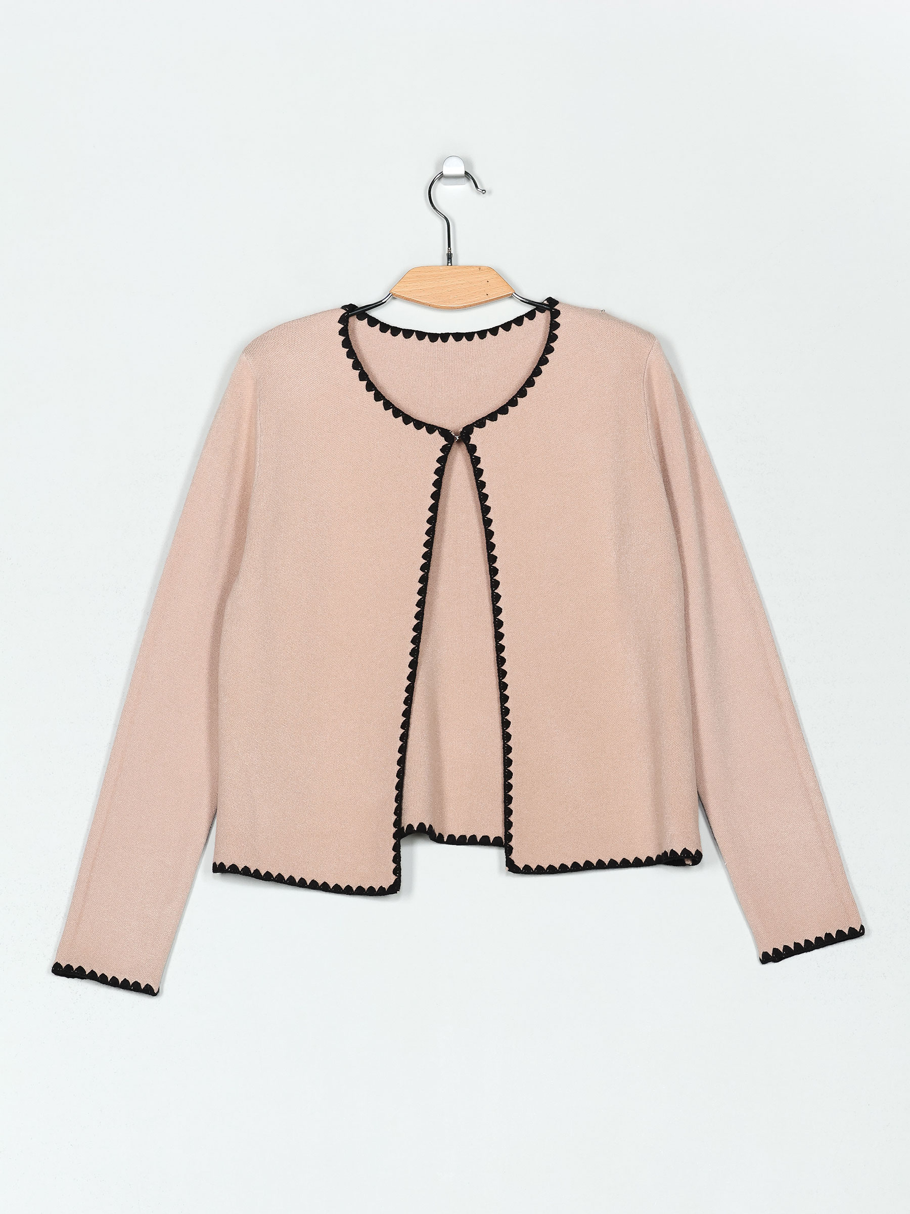 Chaqueta de punto cálido. Tacto suave. Detalle pespuntes. Cuello redondo. Manga larga. Cierre mediante corchete.