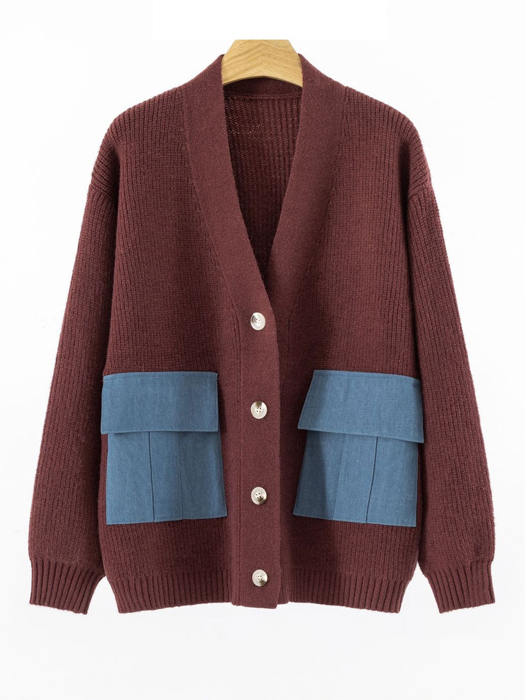 Chaqueta amplia de punto. Cuello pico. Bolsillos delanteros de plastrón con solapa. Manga larga. Cierre mediante botones.