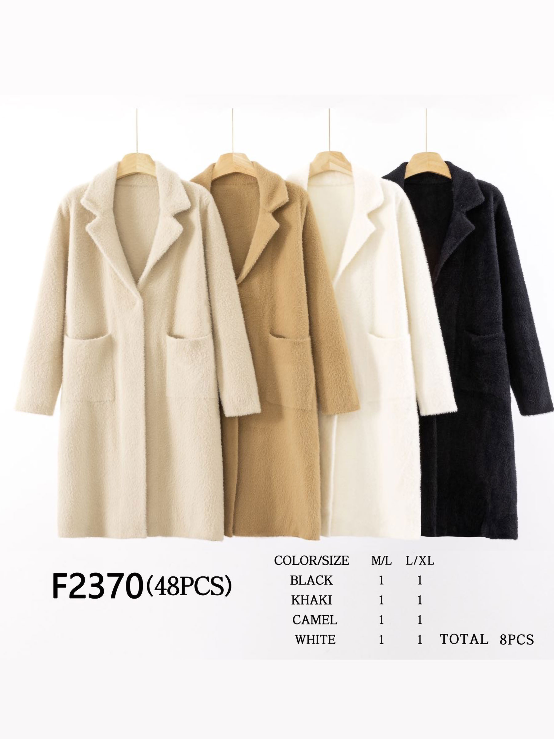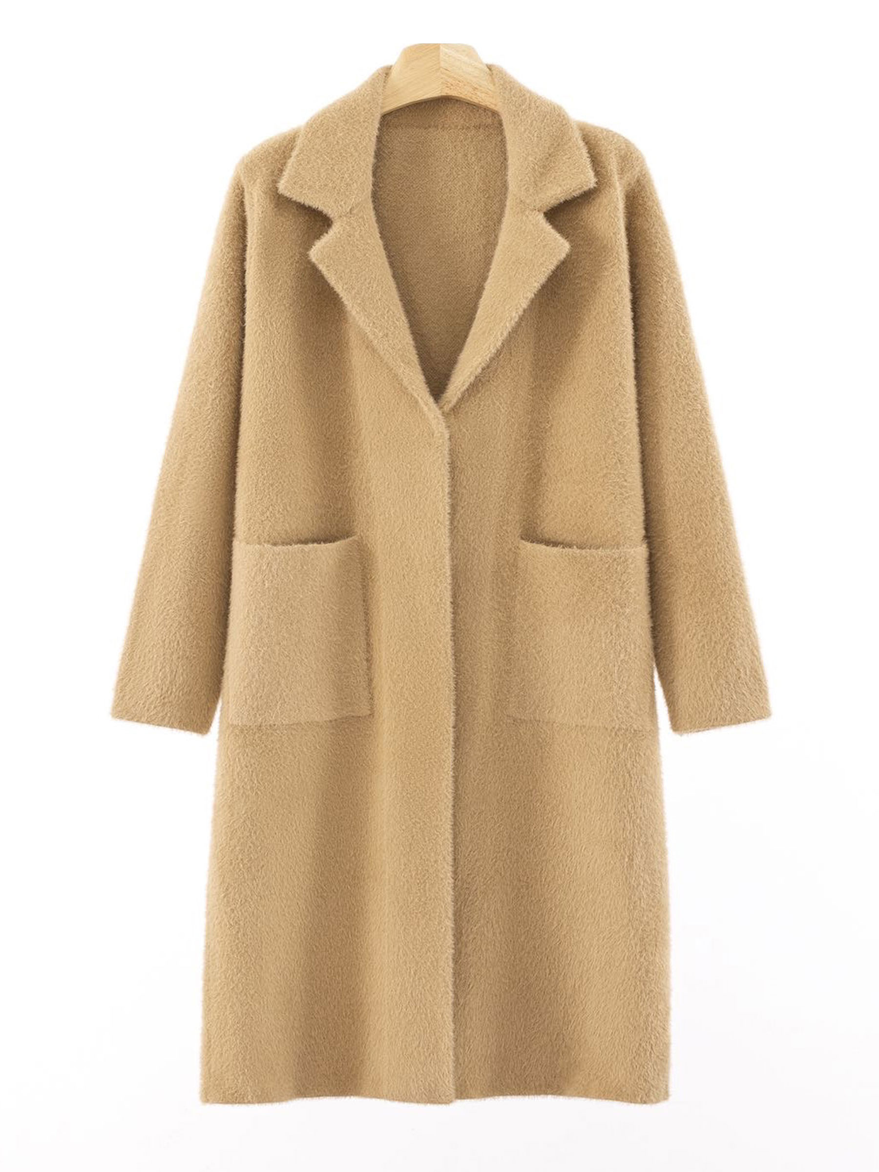 Abrigo largo de punto cálido con pelo. Tacto suave. Cuello solapa. Bolsillos delanteros de plastrón. Manga larga.