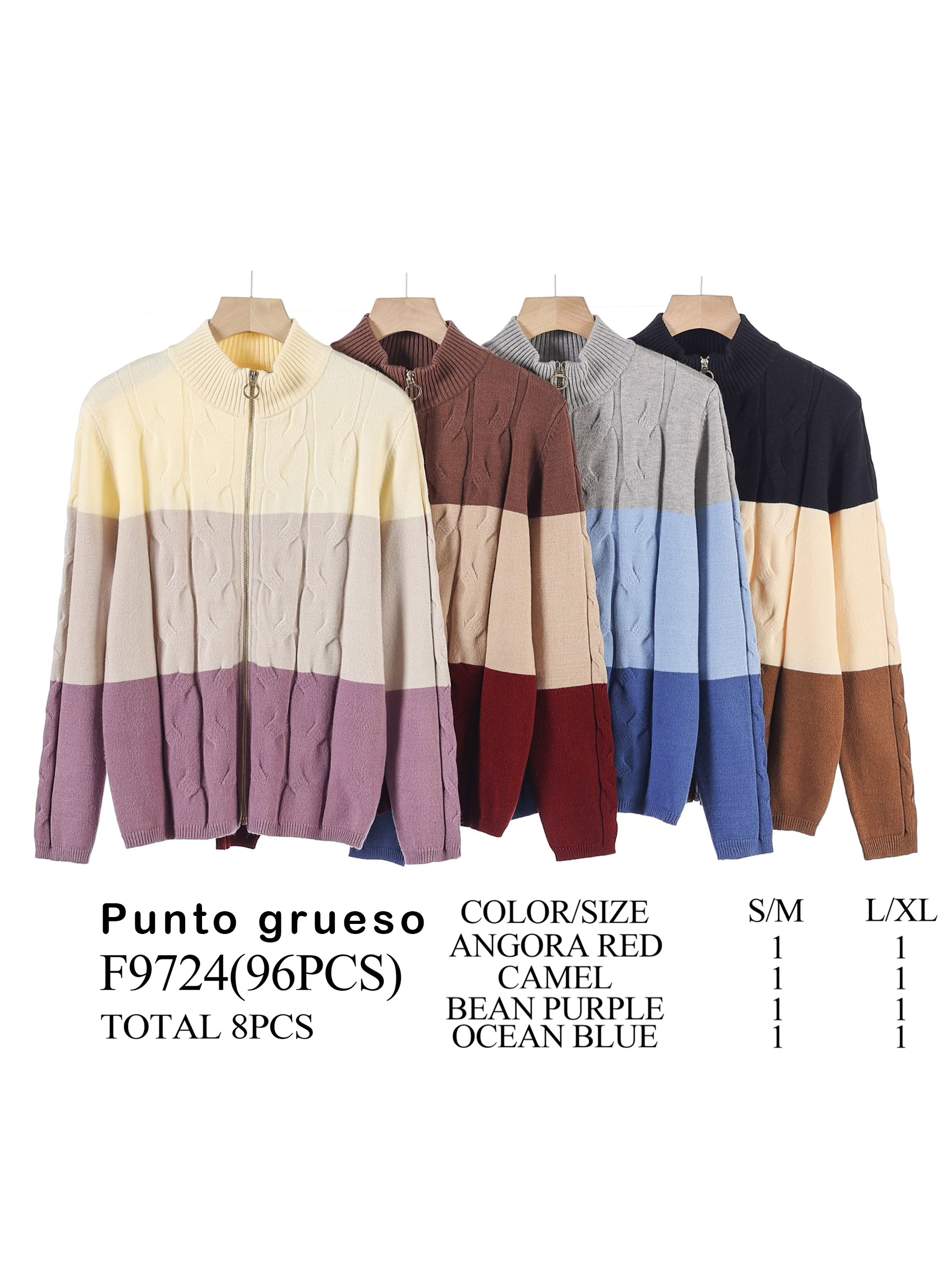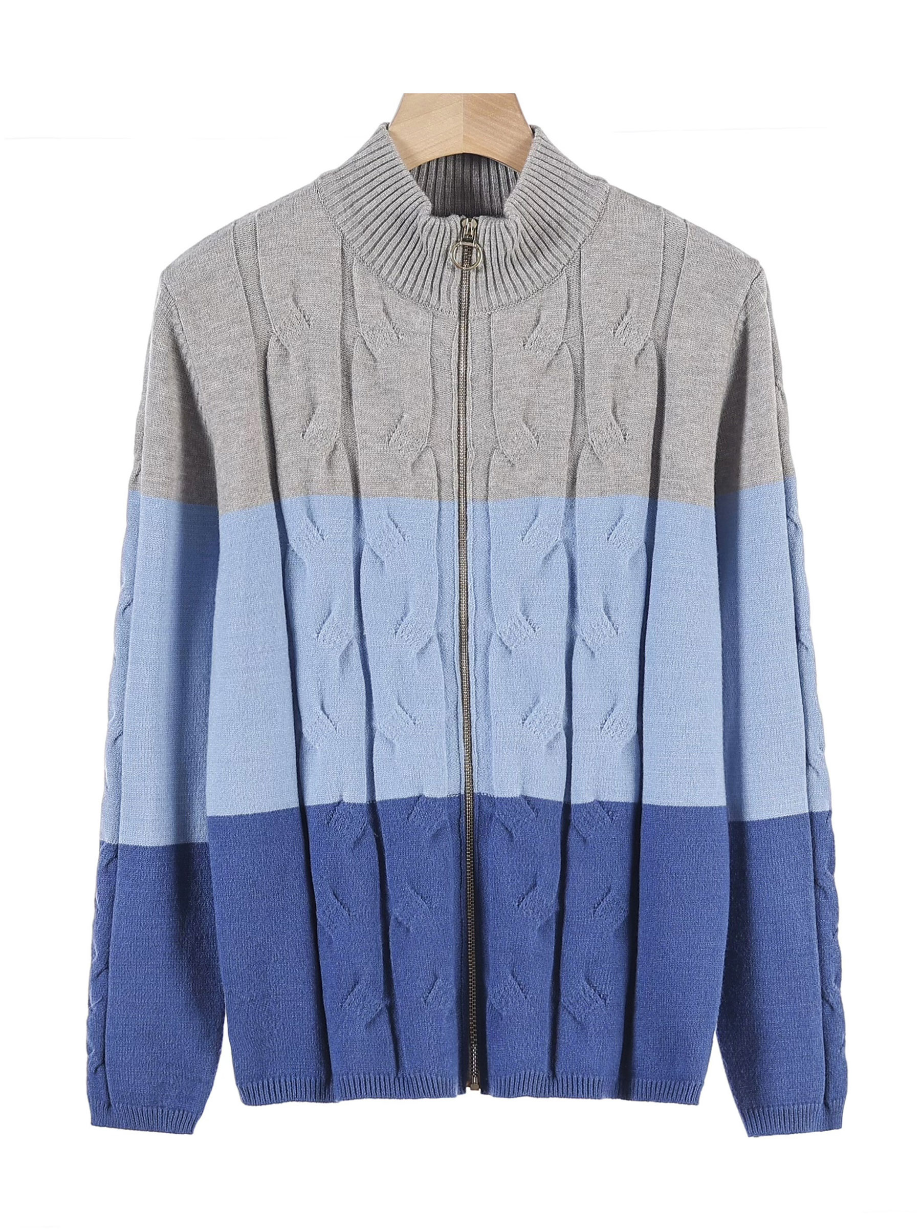 Chaqueta franjas de punto cálido. Cuello perkins. Manga larga. Cierre frontal con cremallera.