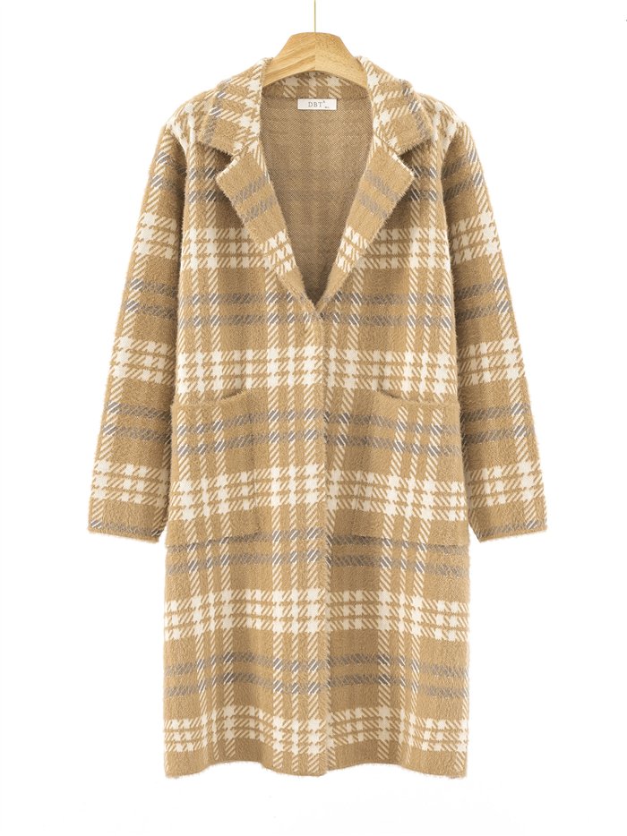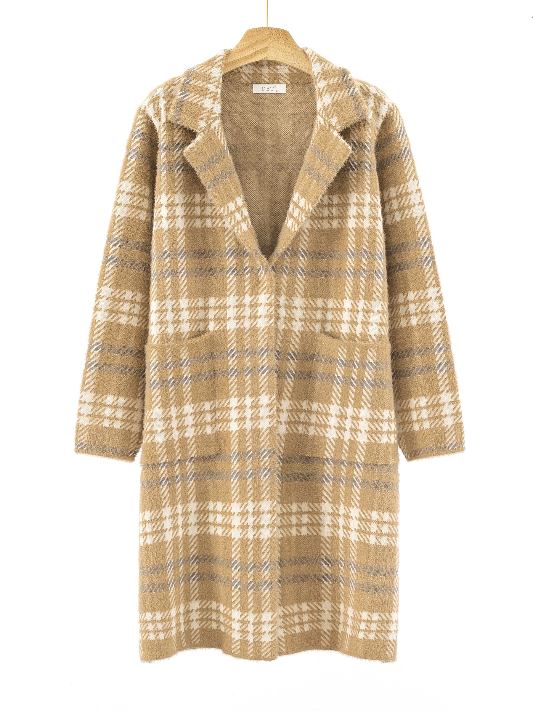 Abrigo largo cuadros de punto cálido con pelo. Tacto suave. Cuello solapa. Bolsillos delanteros de plastrón. Manga larga.