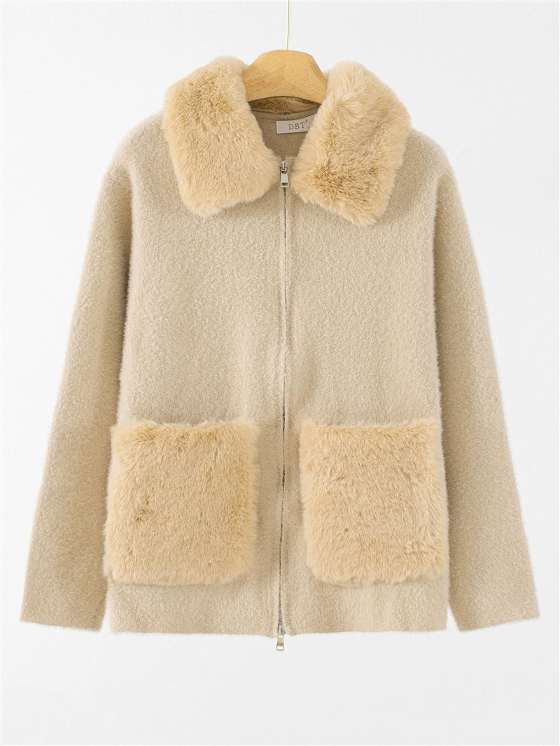 Chaqueta de punto cálido con pelo. Tacto suave. Bolsillos delanteros de plastrón. Manga larga. Cierre delantero con cremallera.