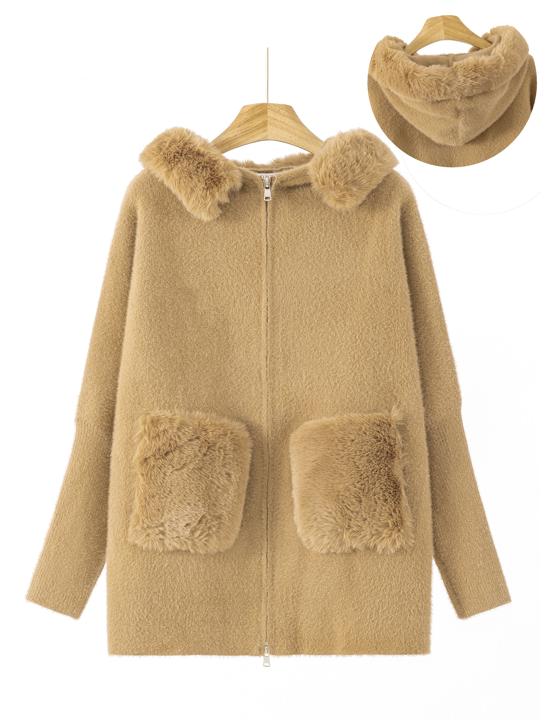 Chaqueta de punto cálido. Capucha con pelo. Tacto suave. Bolsillos delanteros. Manga larga. Cierre delantero con cremallera.