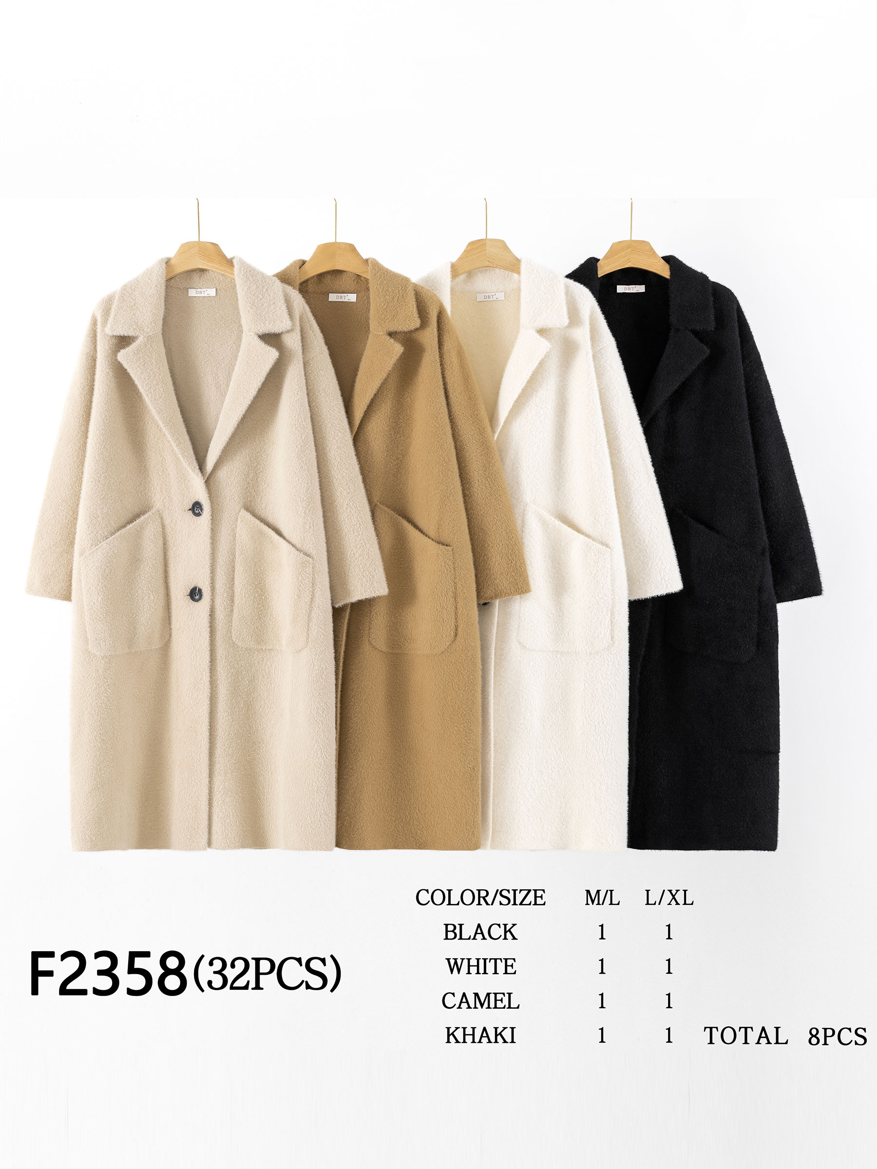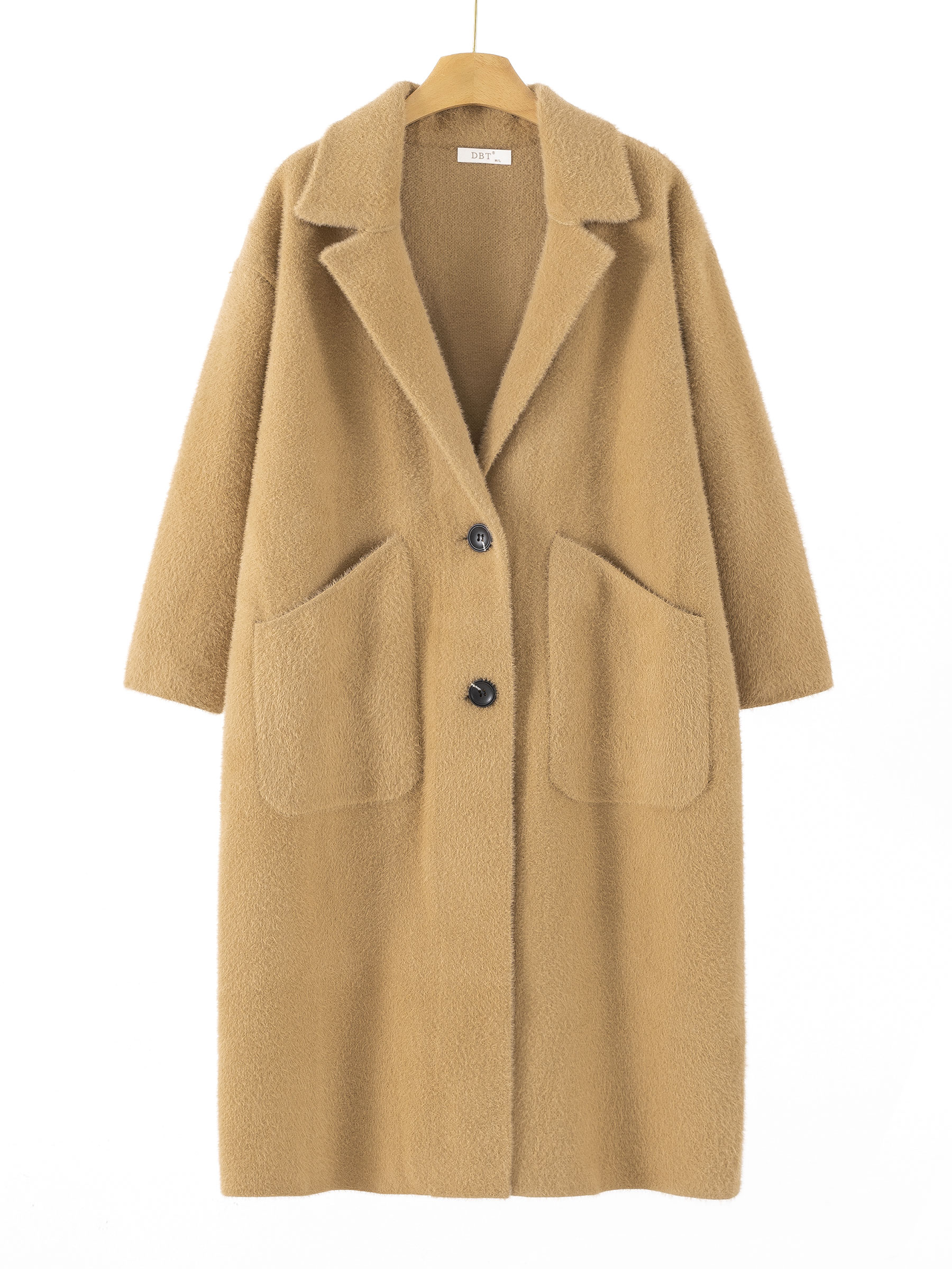 Abrigo largo de punto cálido con pelo. Tacto suave. Cuello solapa. Bolsillos delanteros de plastrón. Manga larga. Cierre mediante botones.