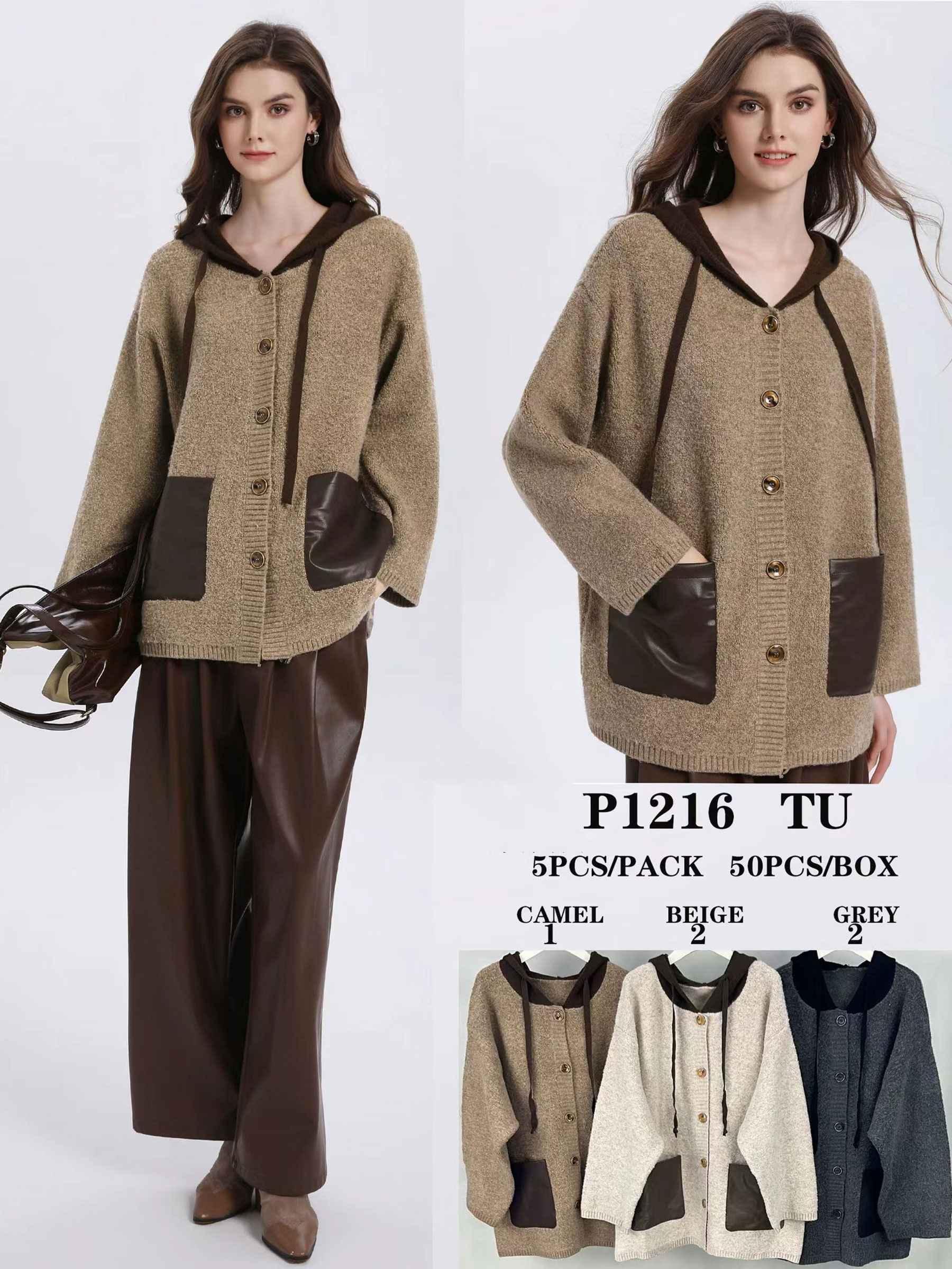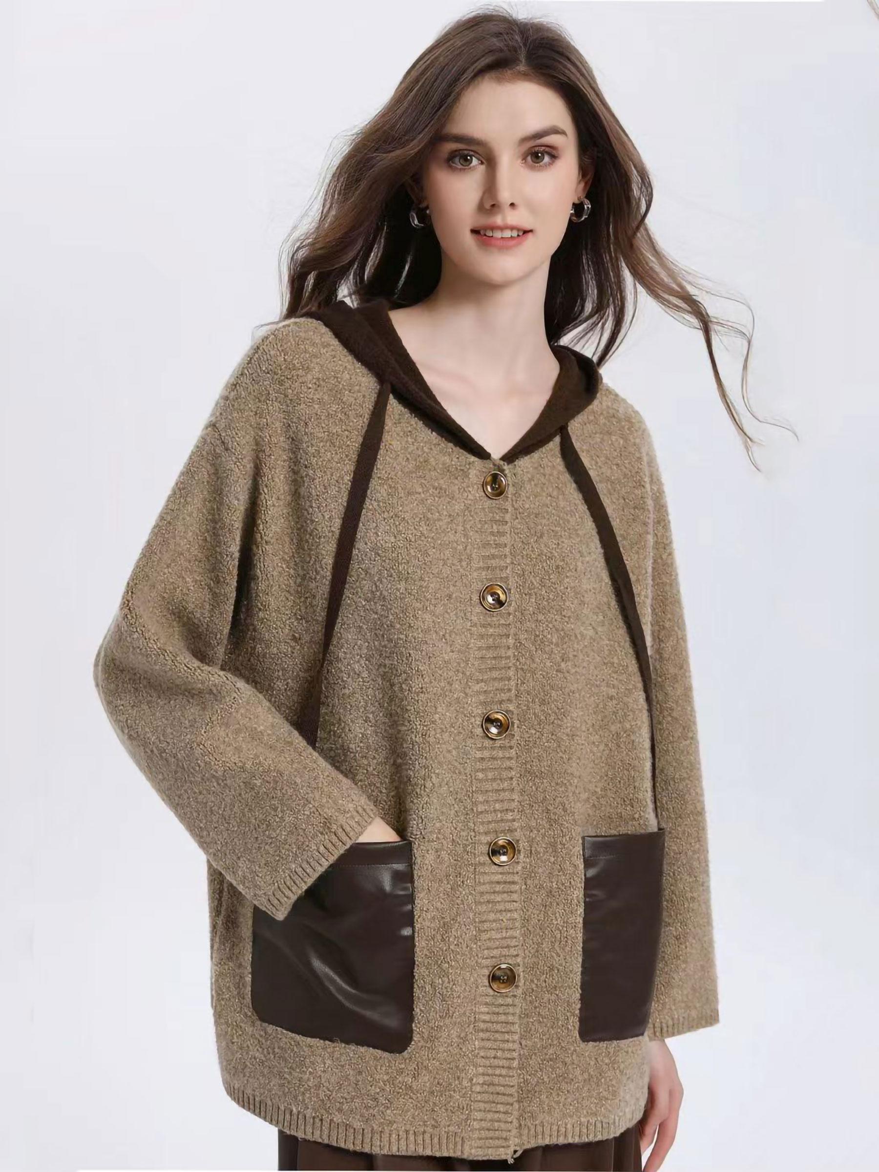 Chaqueta de punto grueso con capucha, cierre de botones delanteros y bolsillos de parche en polipiel.