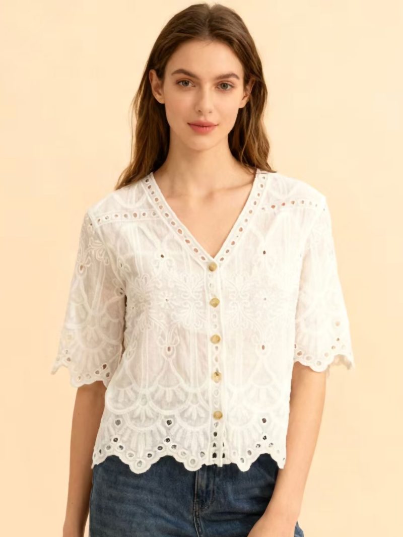 Chaqueta sangallo. Bordado calado. Cuello pico. Manga corta. Cierre mediante botones. Bajo festoneado.